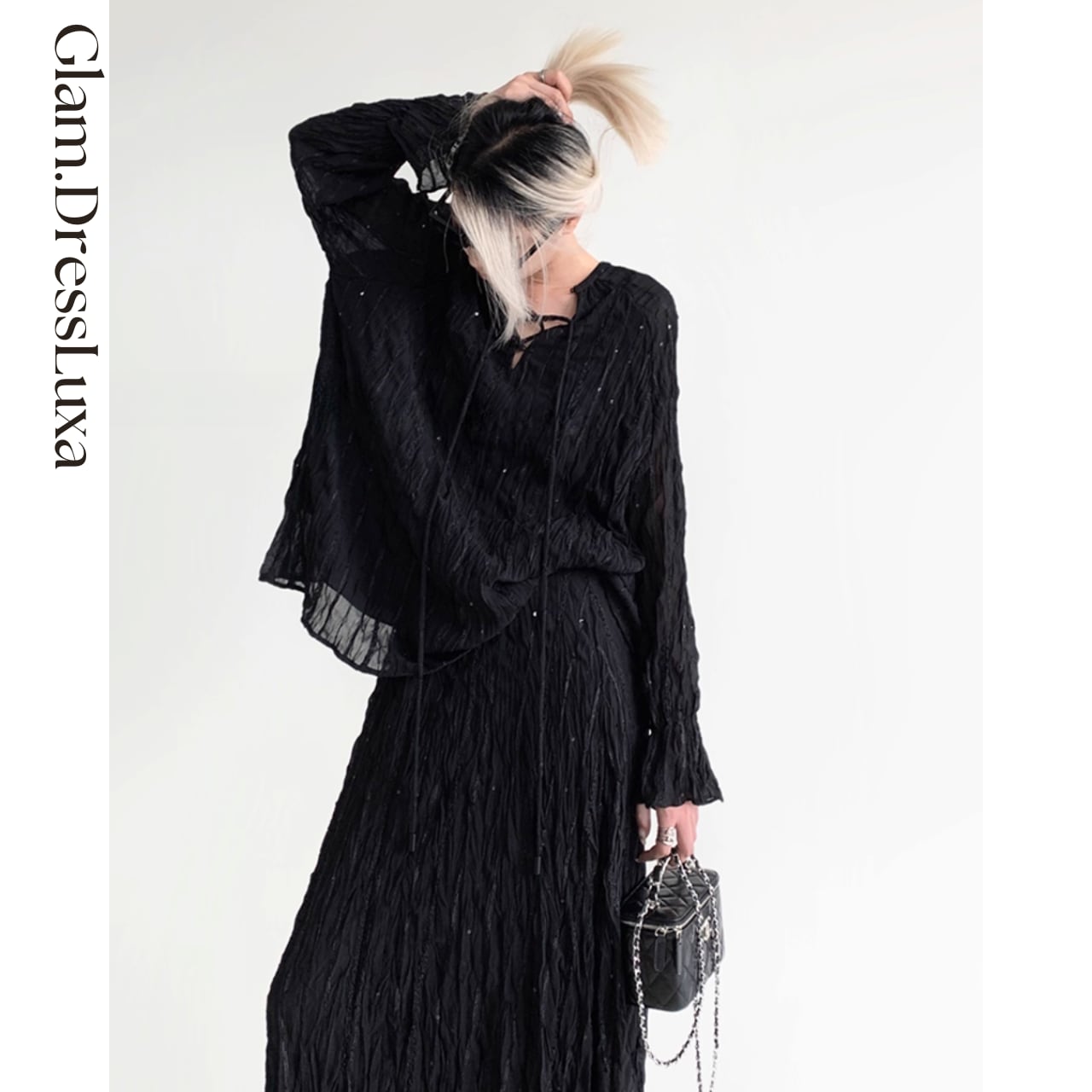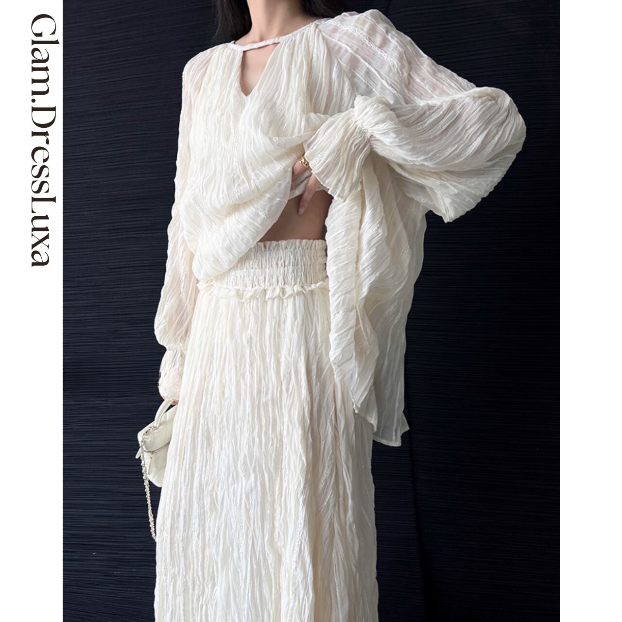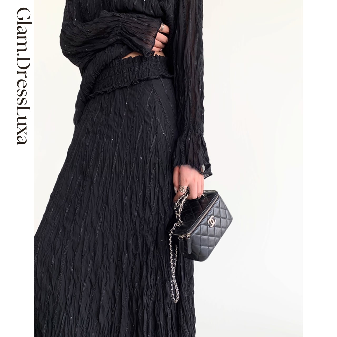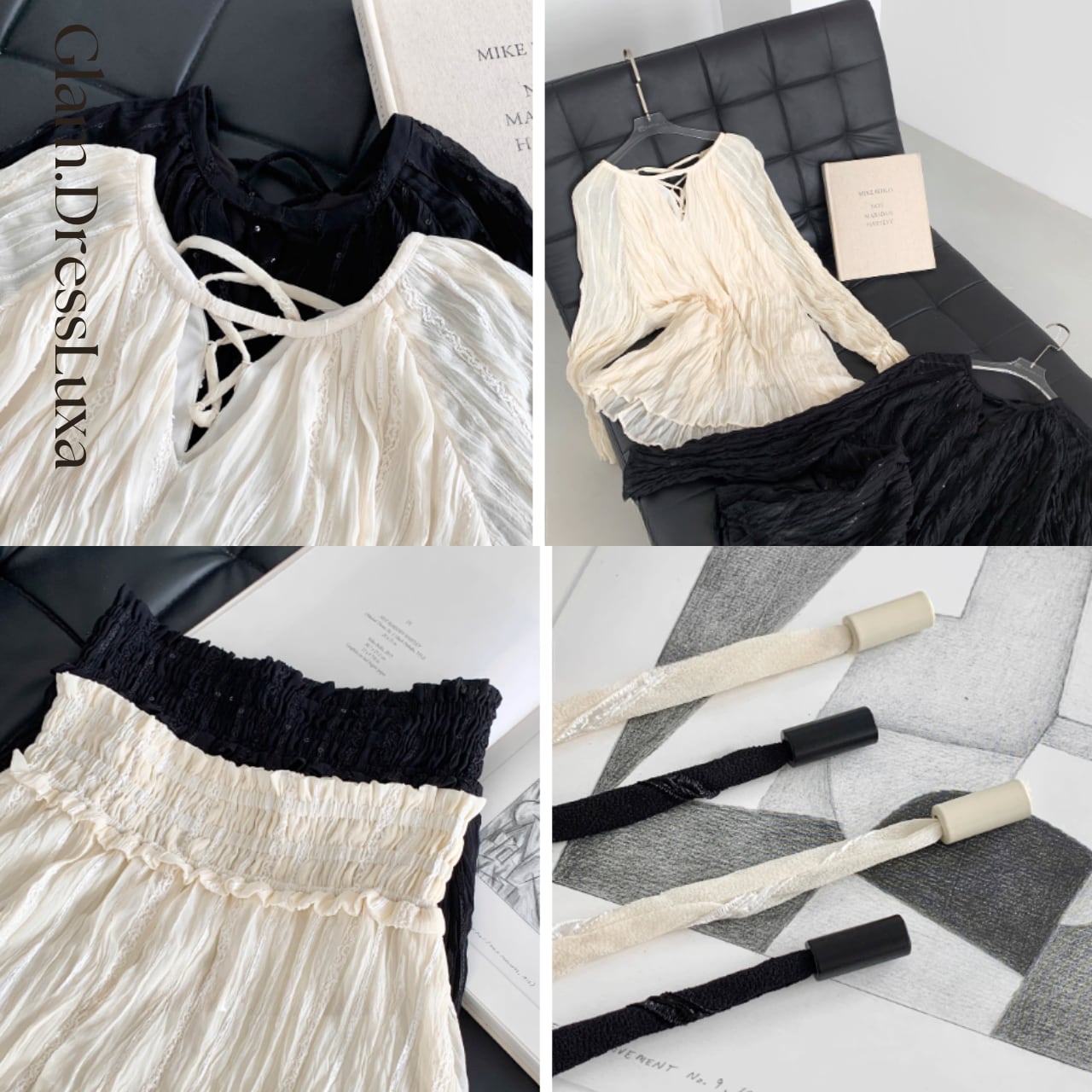 ・立体感のあるシャーリング加工に繊細な光沢ラメを散りばめた、エレガントなセットアップ。