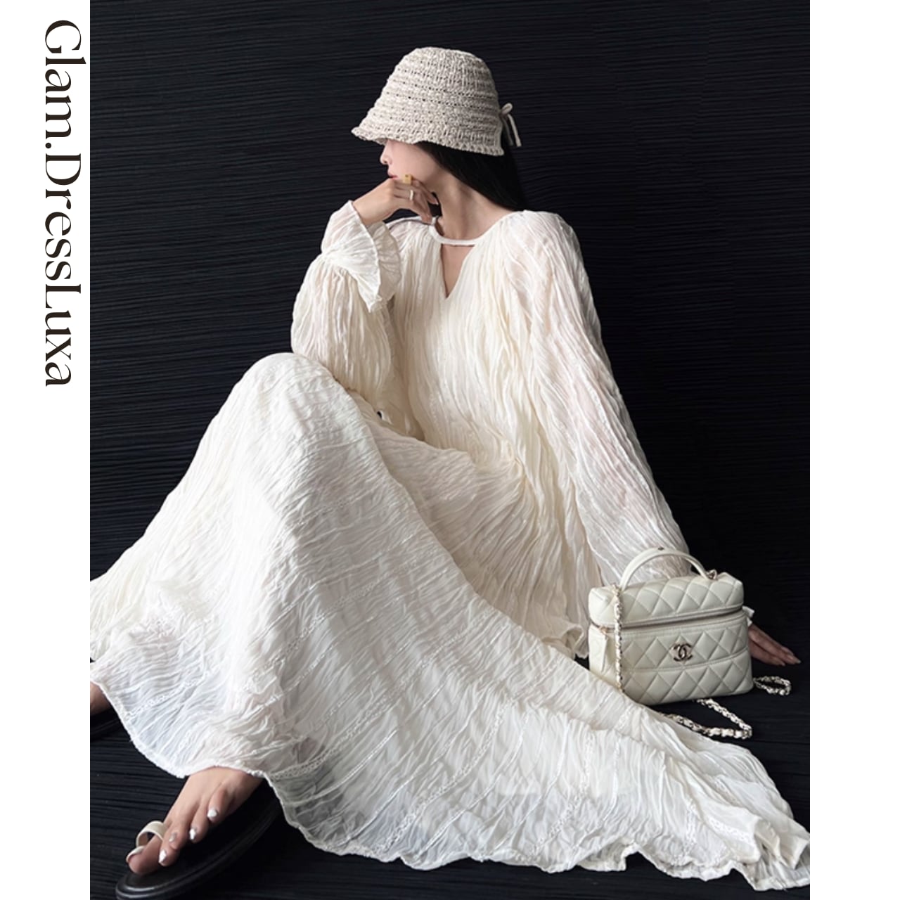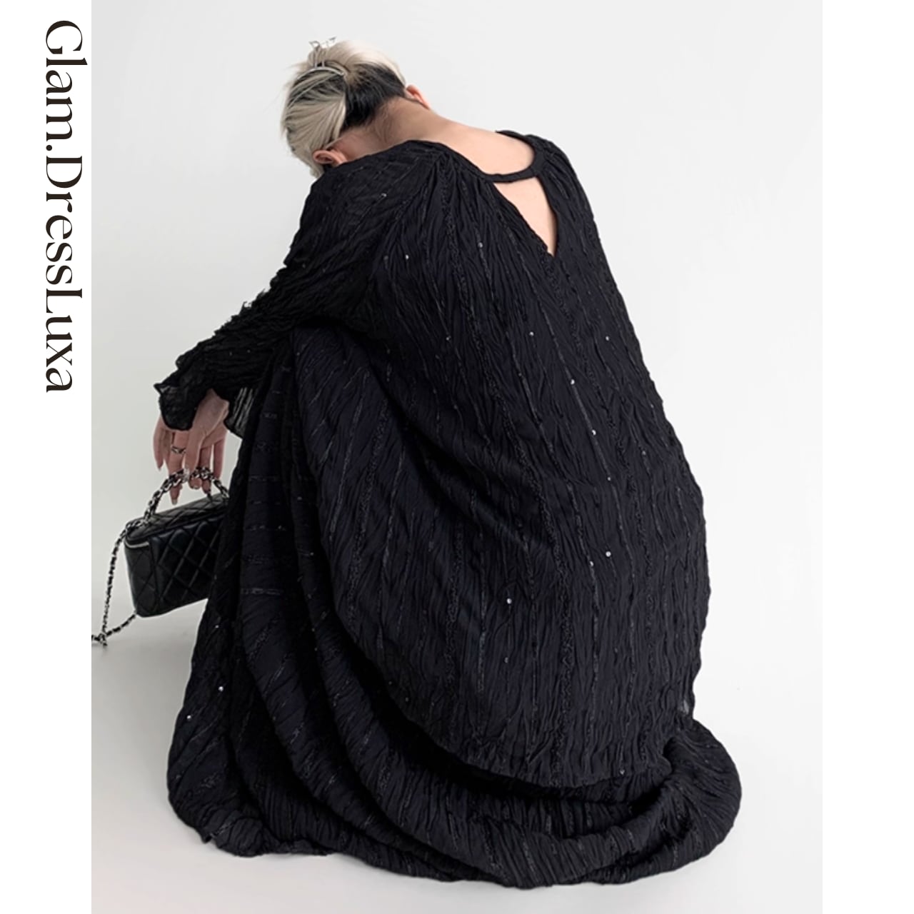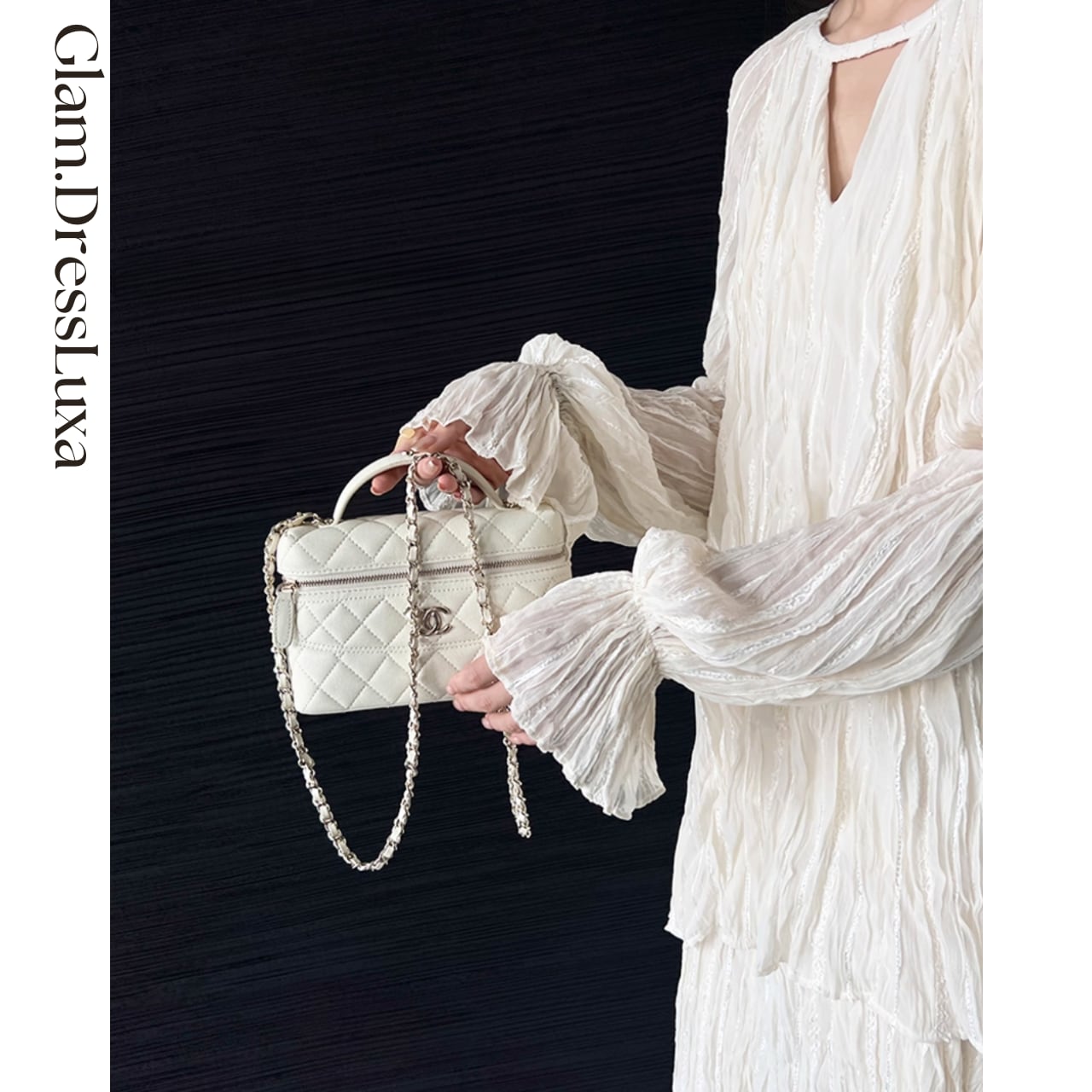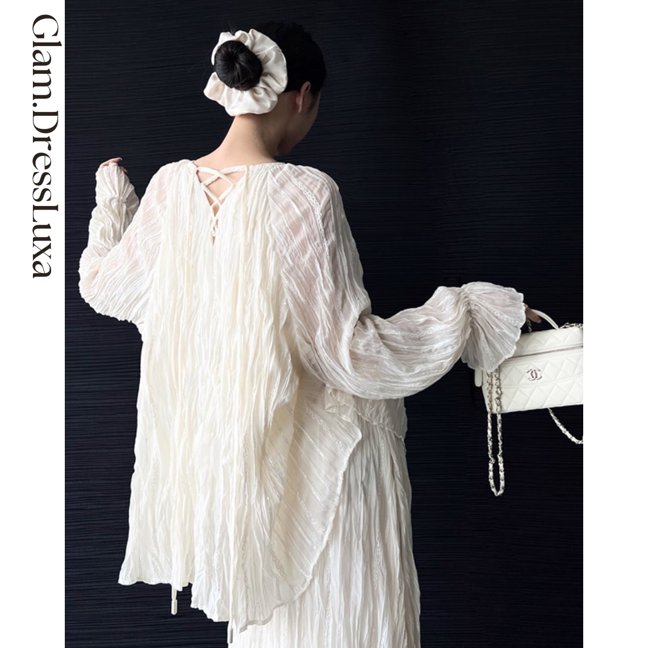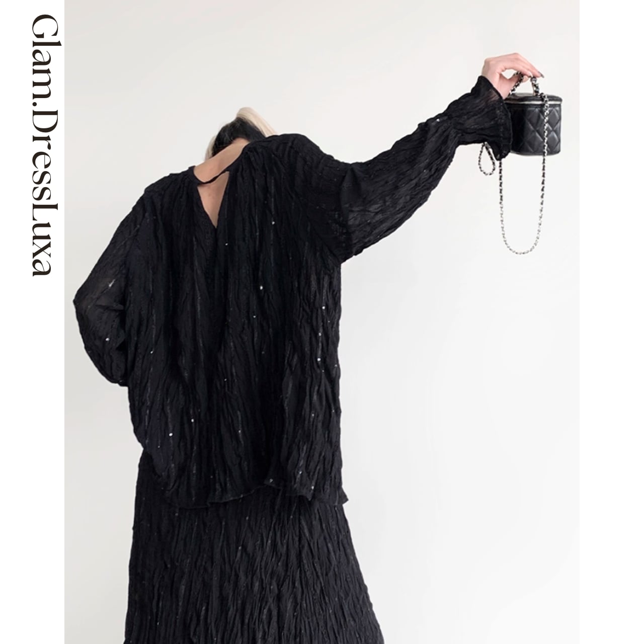 ・立体感のあるシャーリング加工に繊細な光沢ラメを散りばめた、エレガントなセットアップ。