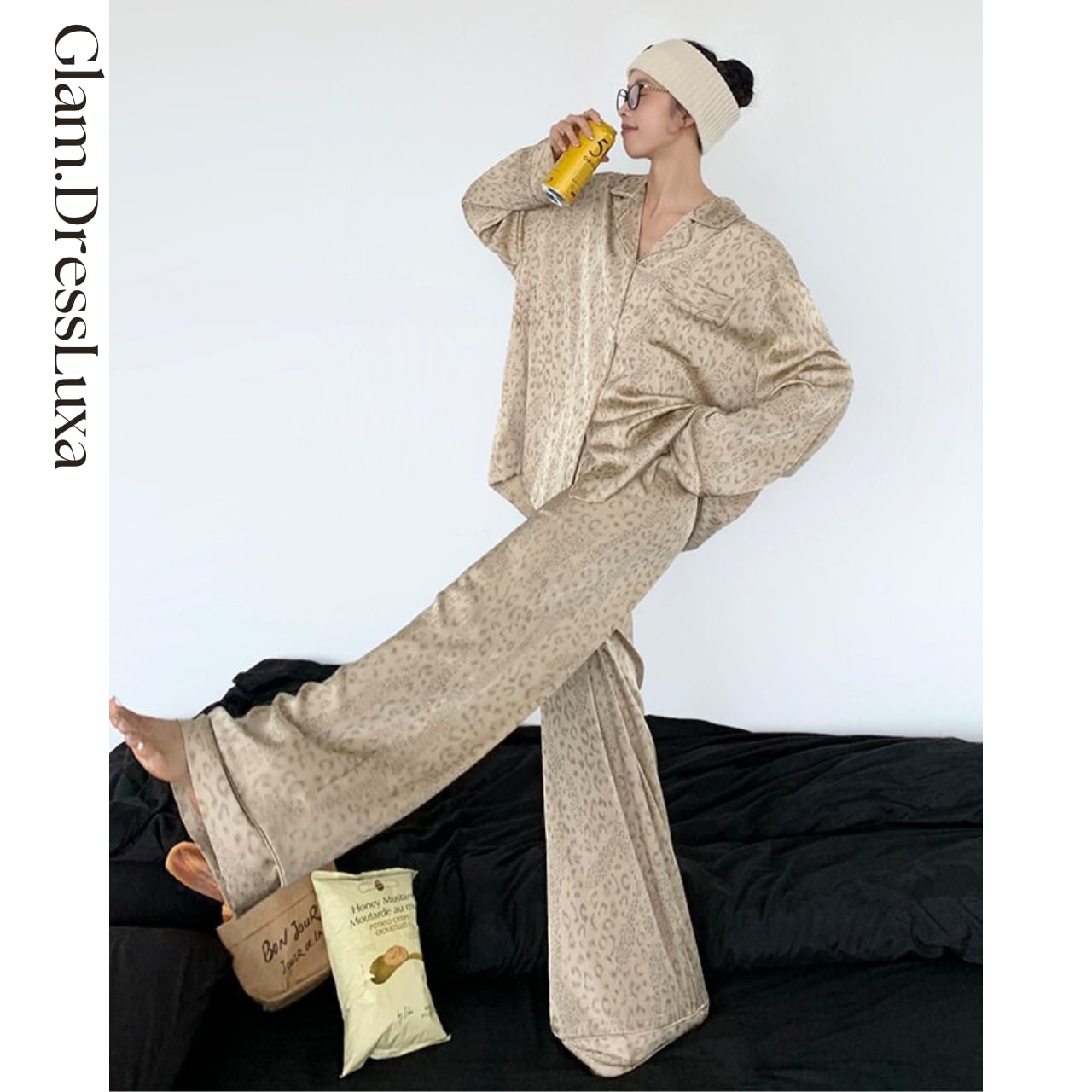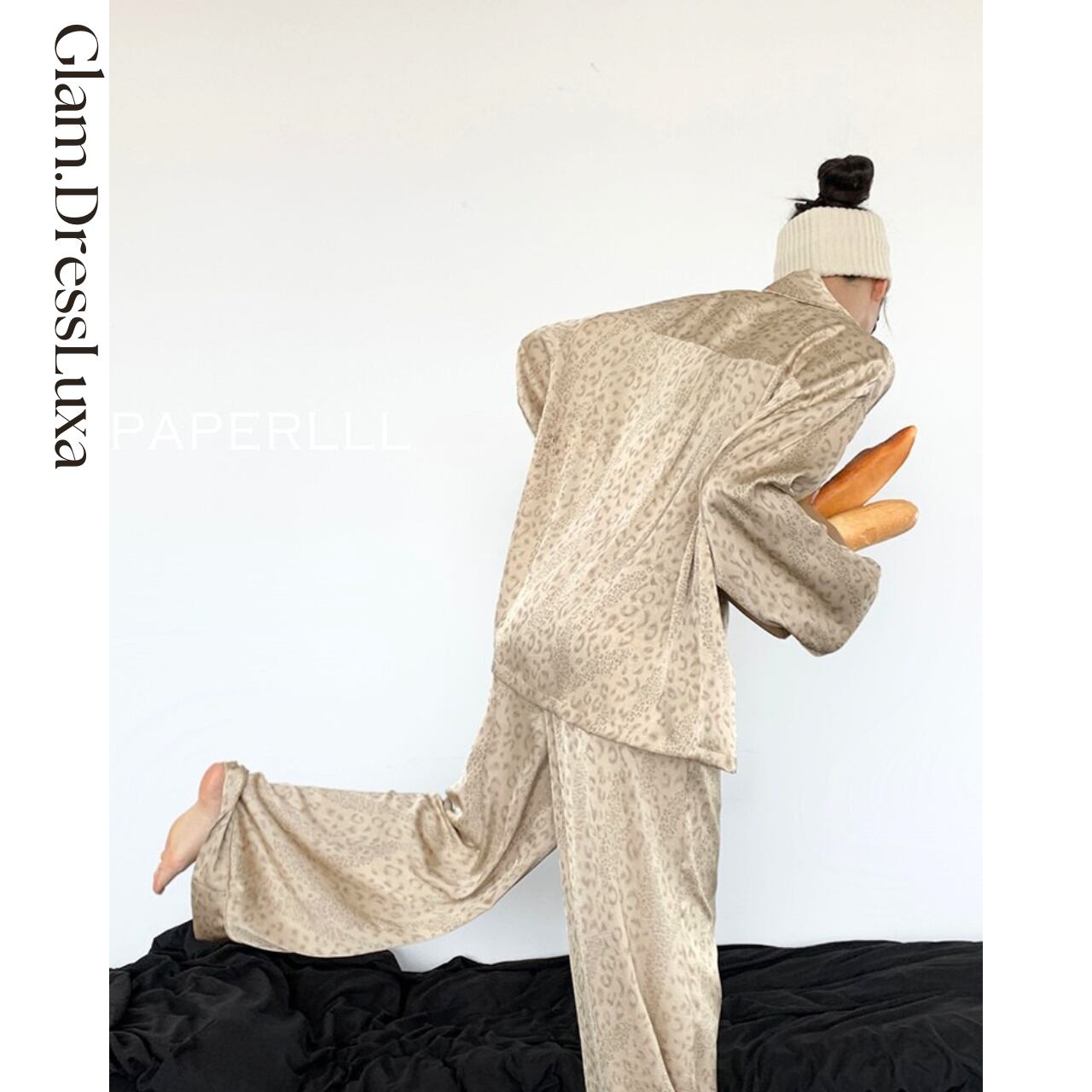 ・ほんのり光沢感のあるサテン地に、上品なレオパード柄を施したルームウェアセット。さらりとした肌触りと落ち感のある素材で、見た目も着心地も抜群。トップスはゆったりとしたシルエットと胸ポケット付きの開襟デザインで、抜け感のある印象に。パンツはウエストゴム仕様でリラックス感たっぷり。おうち時間はもちろん、ホテルステイや旅行用にもぴったりな1着です。