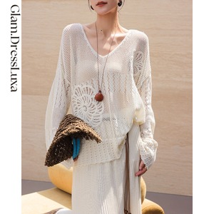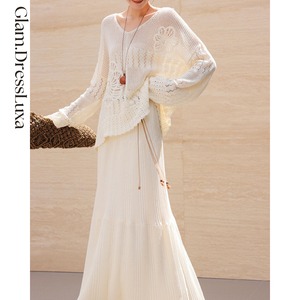 ・透け感のあるクロシェ編みトップスと、リブ素材のロングスカートを組み合わせた上品なセットアップ。