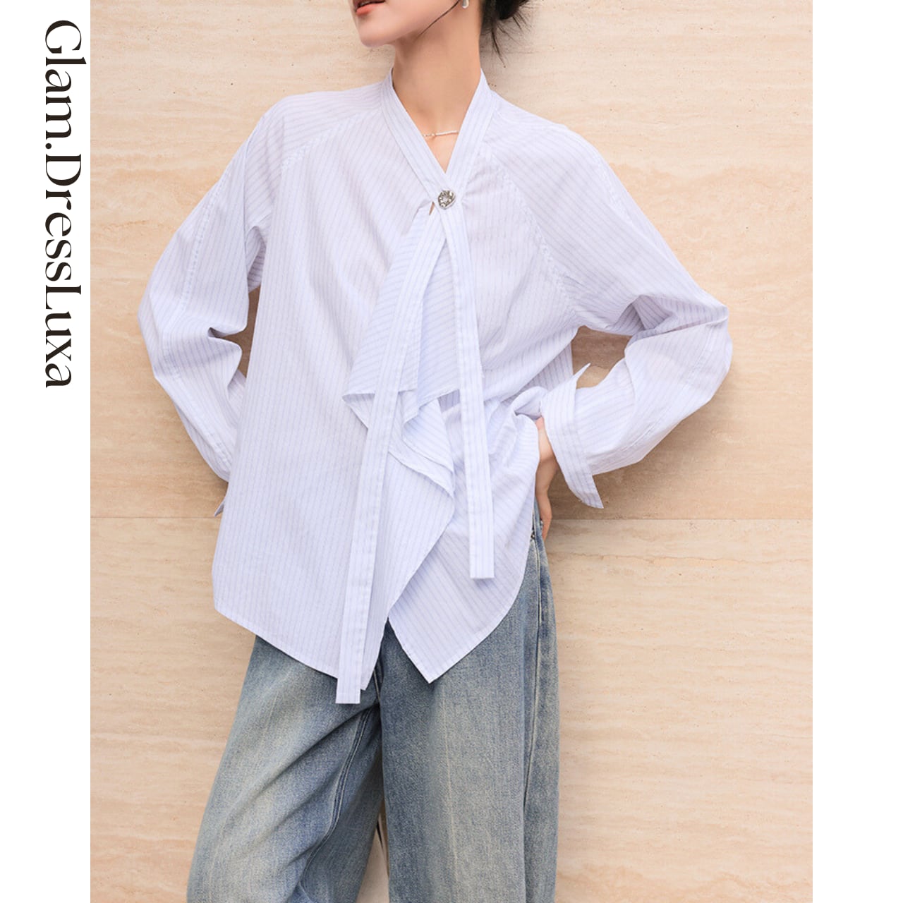・モード感漂うアシンメトリーデザインのストライプシャツ。胸元のボタンディテールと流れるようなリボンが、シンプルな中に洗練されたアクセントをプラスします。軽やかなストライプ柄は爽やかで、デニムやスラックスと合わせて大人カジュアルにも、スカートと合わせて上品な着こなしにもマッチ。羽織りとしても活躍し、季節を問わず着回し可能な一枚です。
