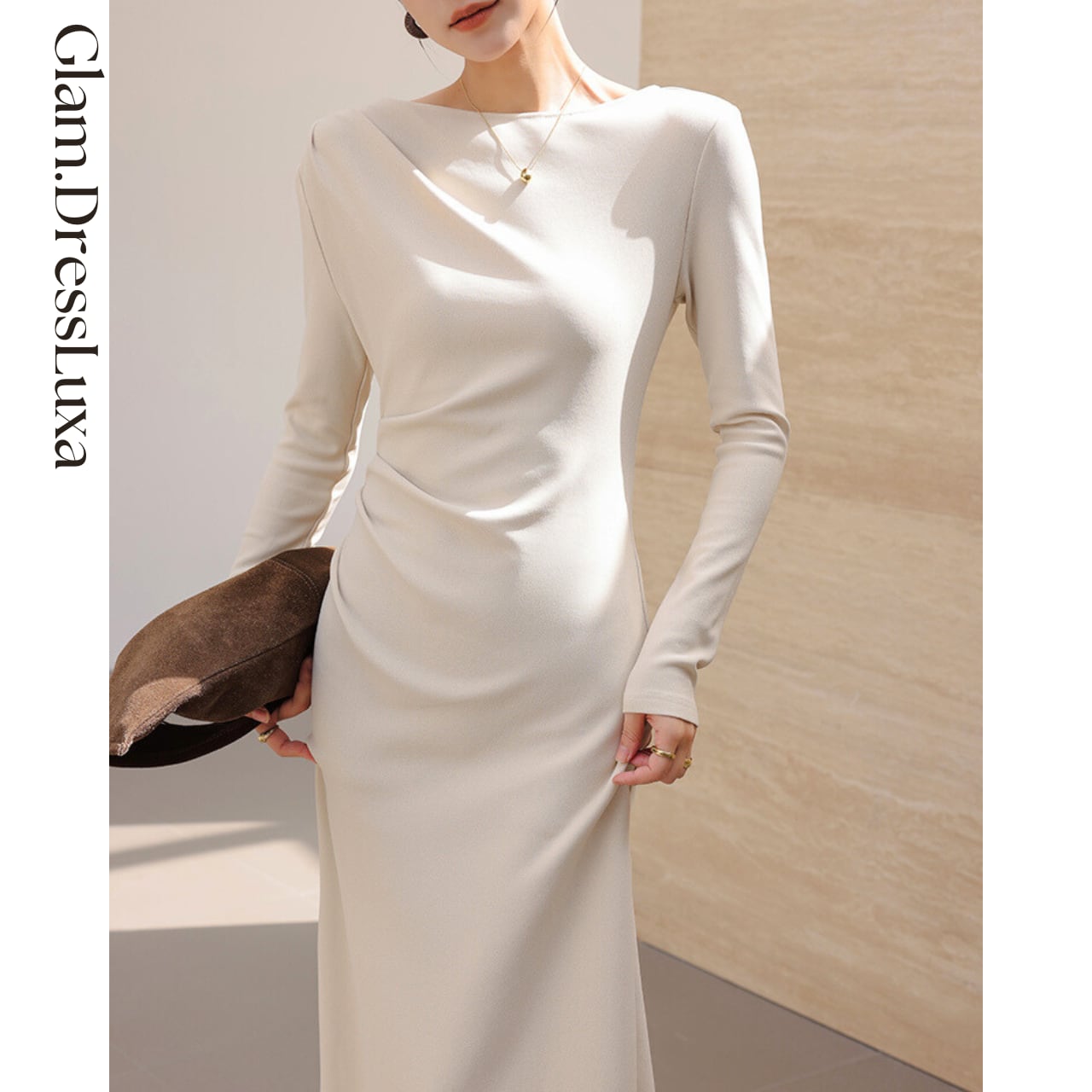 アシンメトリーに寄せたドレープデザインが立体感を生み出し、女性らしいラインを美しく演出します。