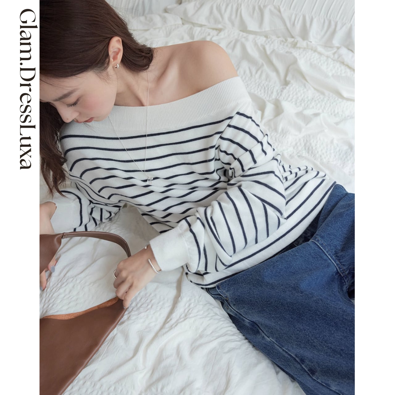 ・肩を落としたオフショルダーシルエットが女性らしい抜け感を演出するボーダーニットトップス。