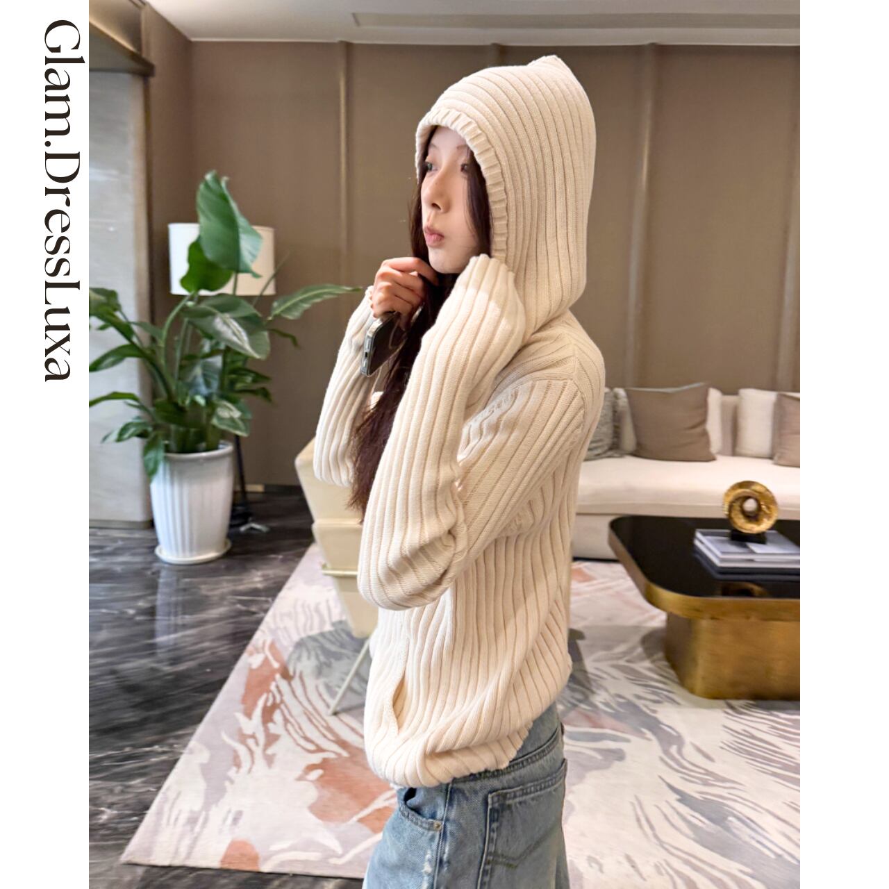 ・立体感のあるリブ編み素材を使用した、フーディーデザインのニットトップス。
