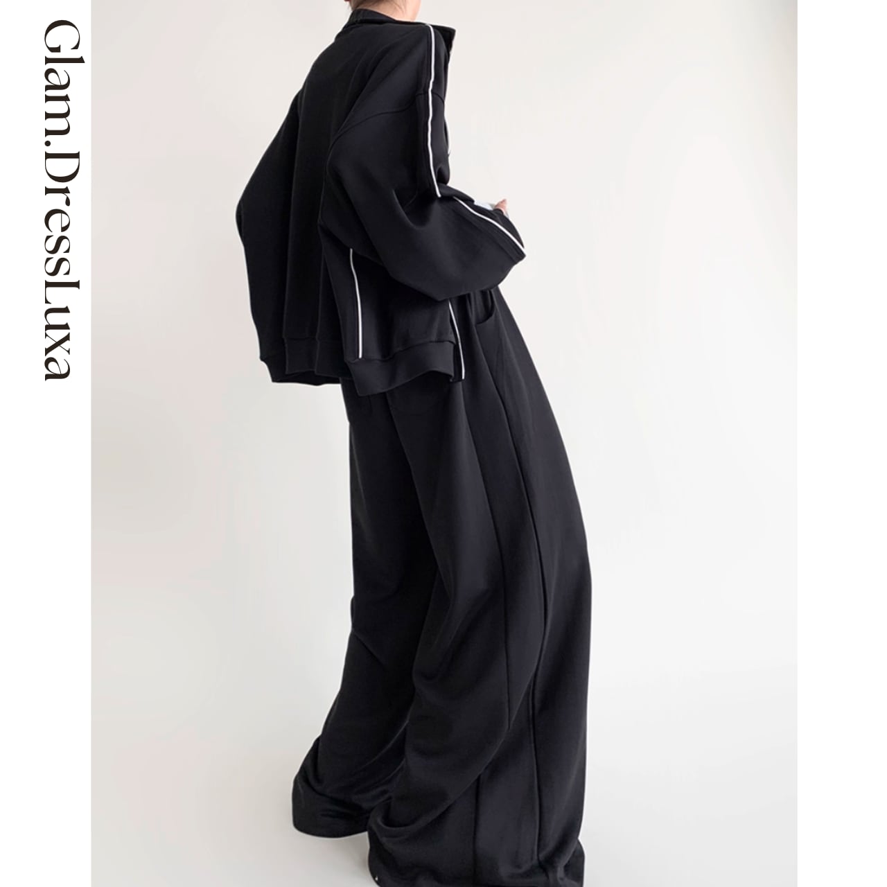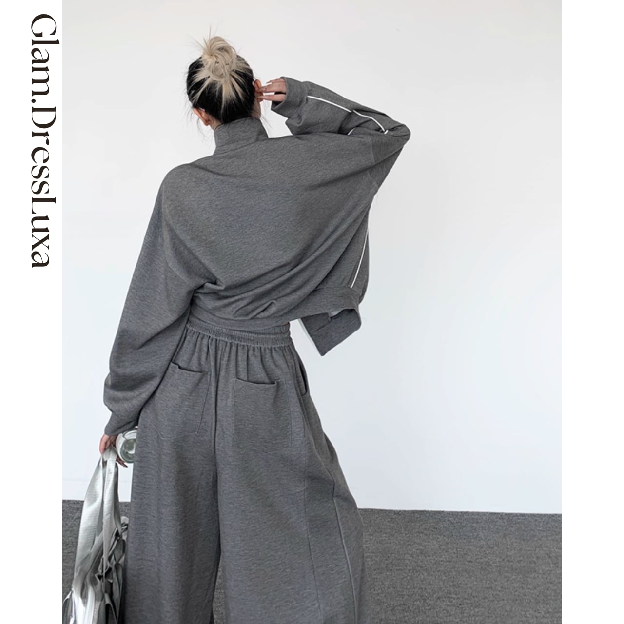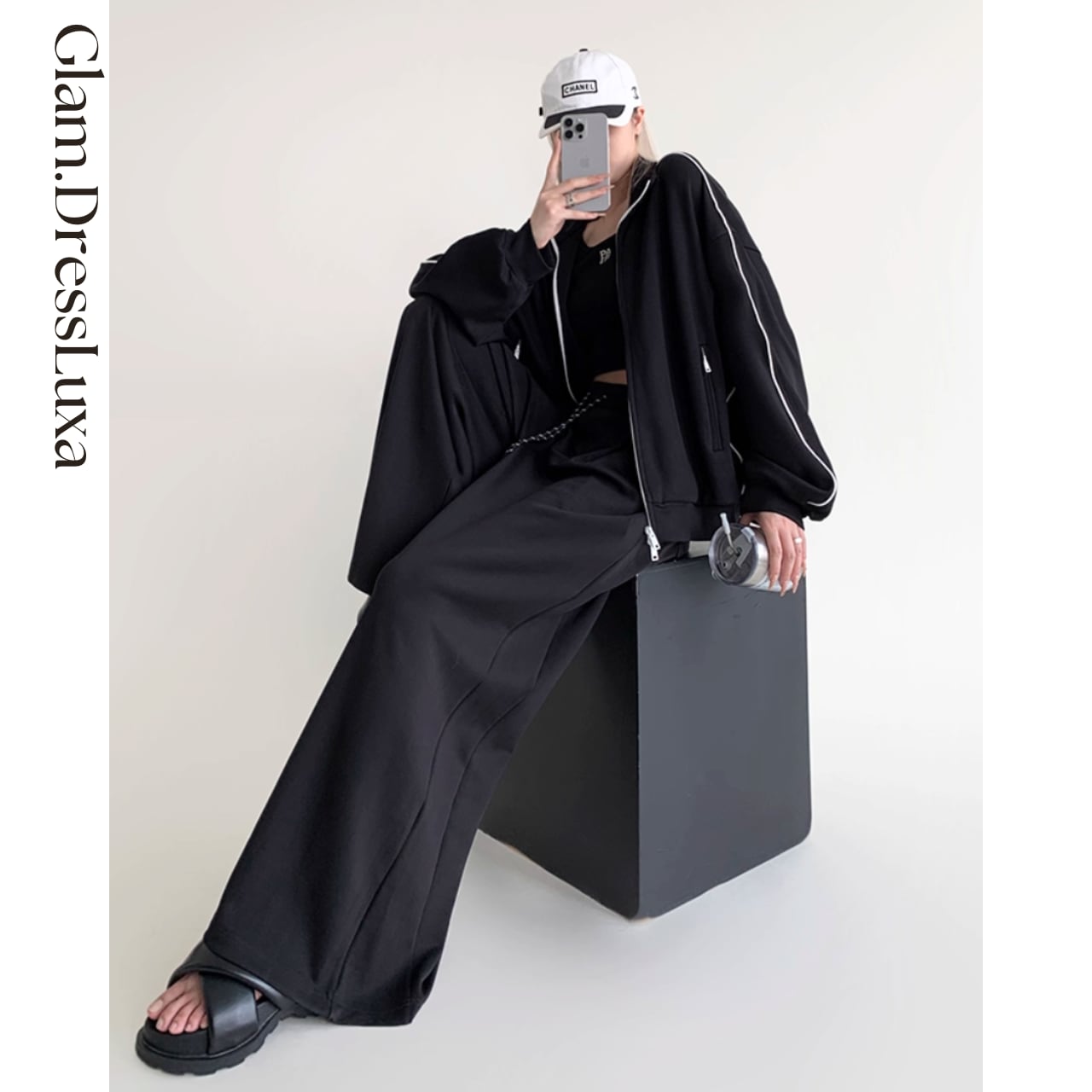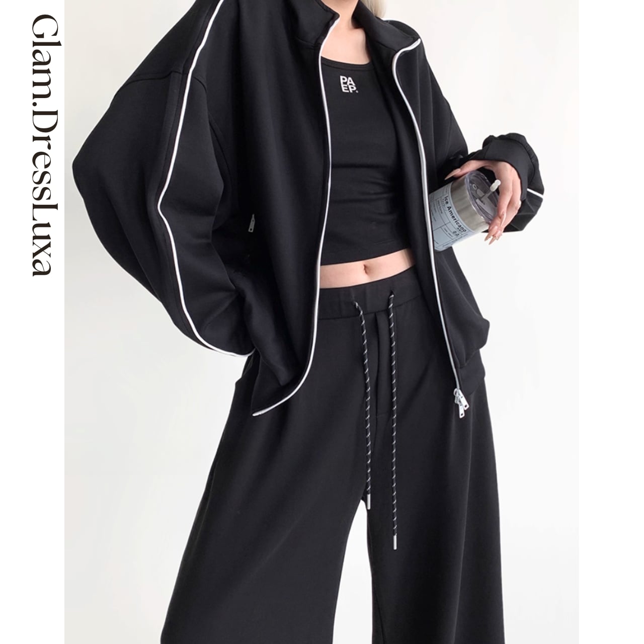 ・サイドに配されたパイピングラインが印象的なトラックジャケットと、リラックス感のあるワイドパンツのセットアップ。