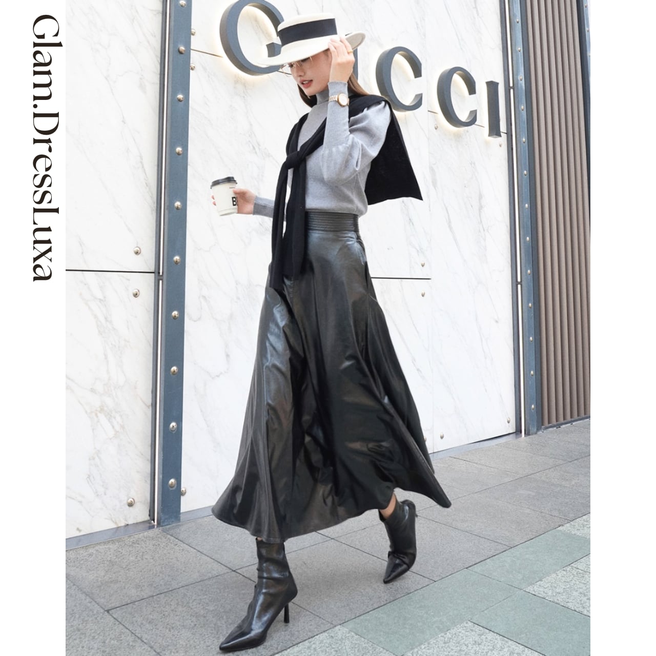 ・しなやかなフェイクレザーを使用したフレアロングスカート。