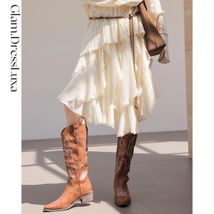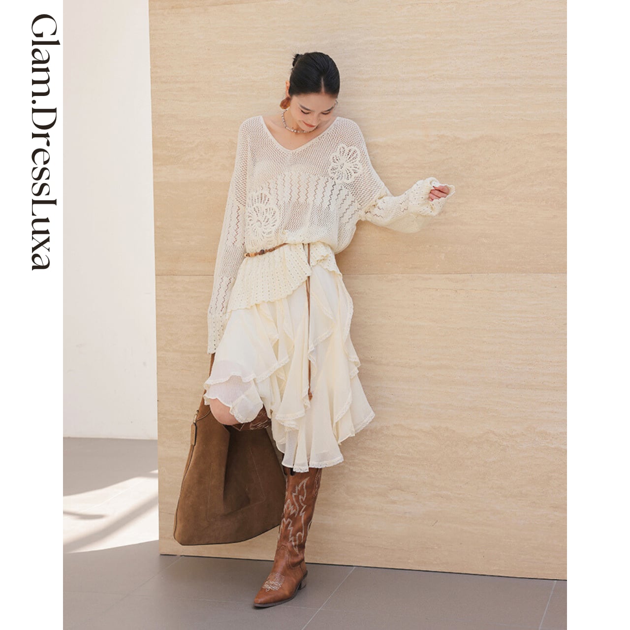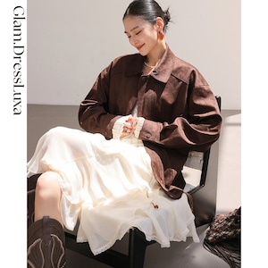 ウエストから裾へと流れるフレアラインが女性らしい華やかさを演出し、歩くたびに揺れるシルエットが上品で存在感のある一枚です。