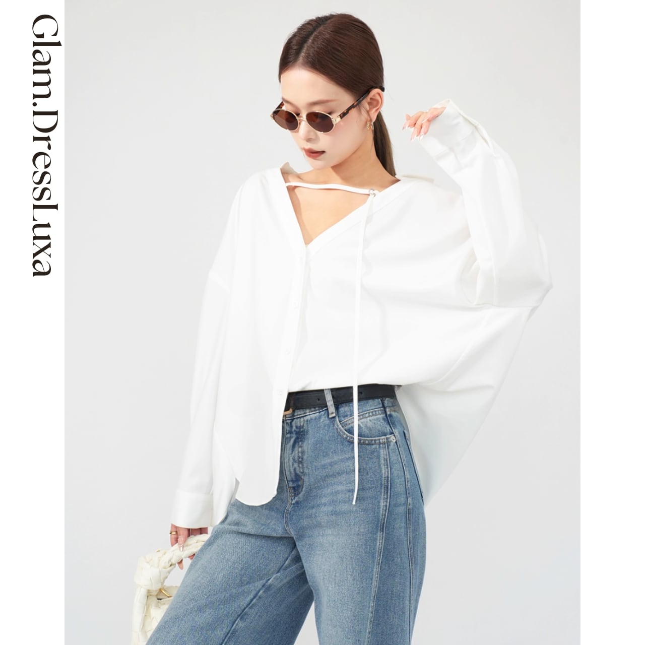 ・ネックラインに施された華奢なストラップが、モードな印象を添えるルーズシャツ。