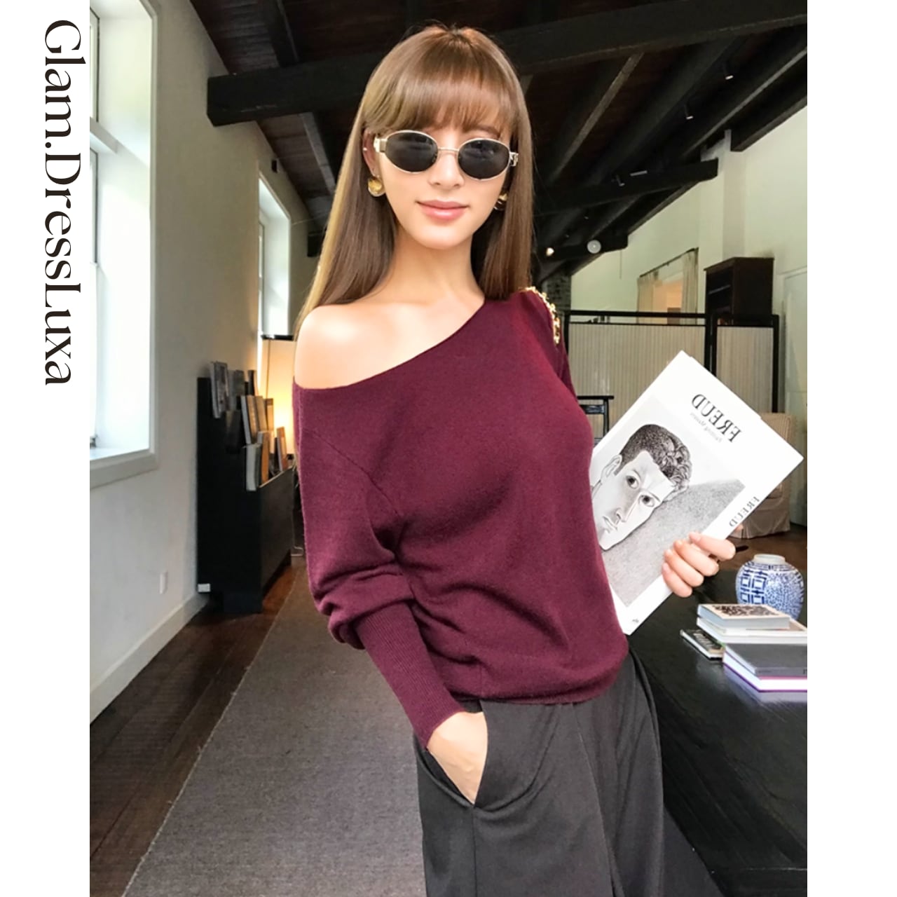 ・大人のこなれ感を演出するオフショルダーデザインのニットプルオーバー。