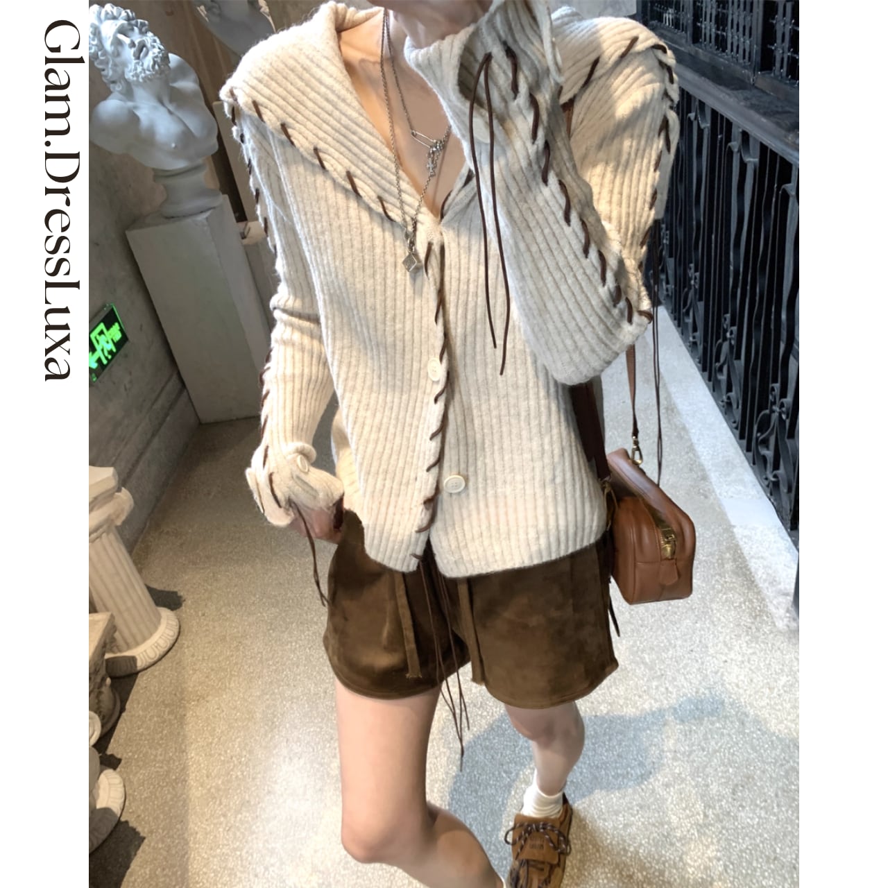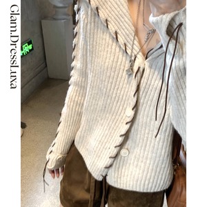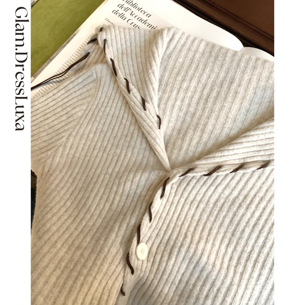 ・立体的なリブ編みにサテンリボンを通したようなデザインが魅力のカーディガン。フロントはすっきりとしたVネックラインで、抜け感のあるシルエットに仕上げました。袖口のボタンディテールがさりげないアクセントになり、カジュアルにもフェミニンにも合わせやすい一枚。シンプルながら表情豊かな素材感で、秋冬コーデの主役として活躍します。