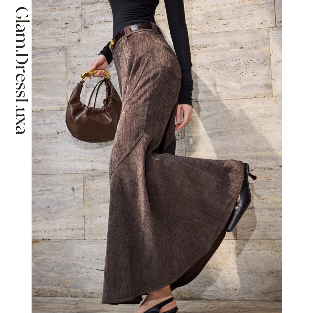 ・エレガントなシルエットを描くアシンメトリーフレアスカート。立体的なカッティングラインが動きに合わせて美しい表情を生み出し、歩くたびに軽やかな揺れ感を演出します。落ち着いたブラウンカラーが大人の雰囲気を引き立て、シンプルなトップスと合わせるだけで洗練されたスタイルに。オン・オフ問わず幅広いシーンで活躍する1枚です。