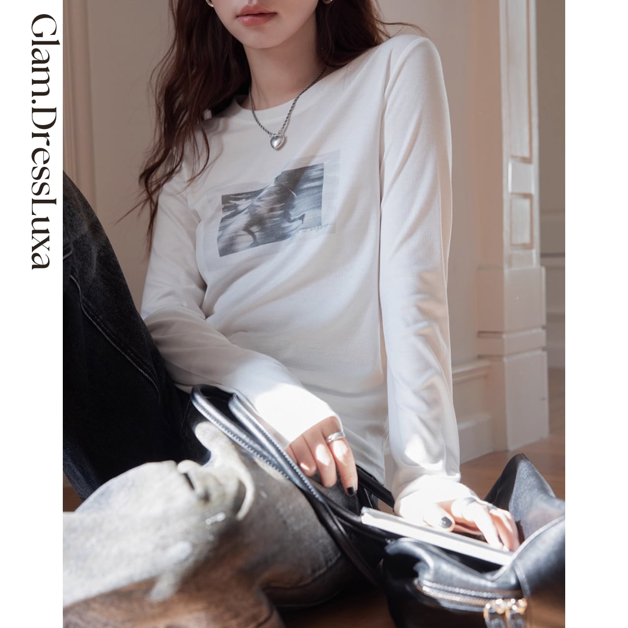 モノトーン調のアートプリントが胸元に映え、シンプルながらも洗練された印象を演出します。
