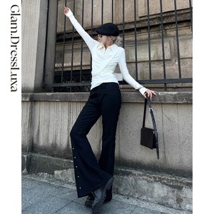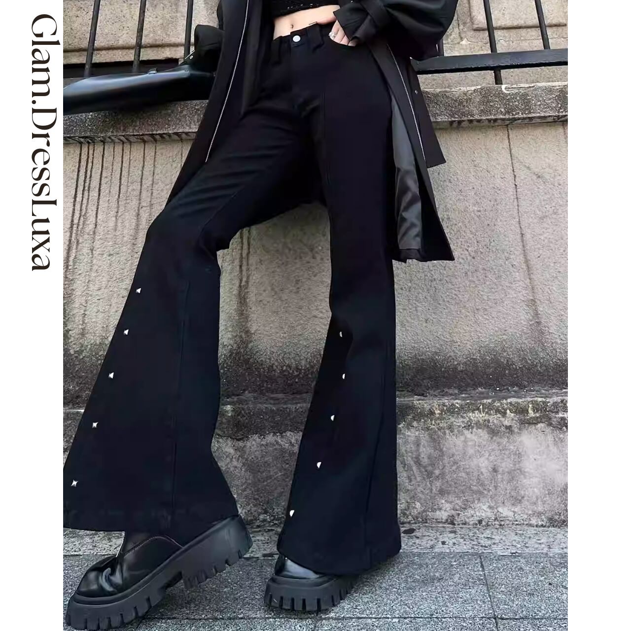 ・脚長効果のあるフレアシルエットに、スタッズを効かせたモードな一本。