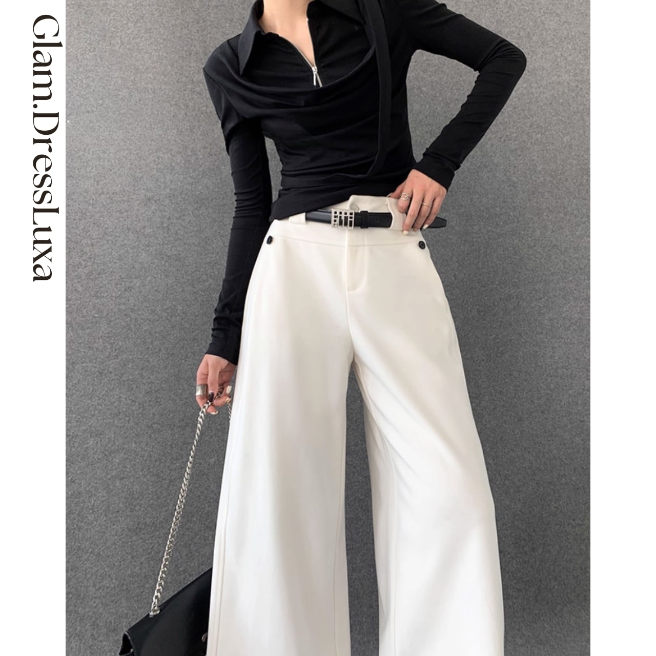 ミニマルなシルエットに、ハイウエストとロングレングスで脚長効果をプラス。