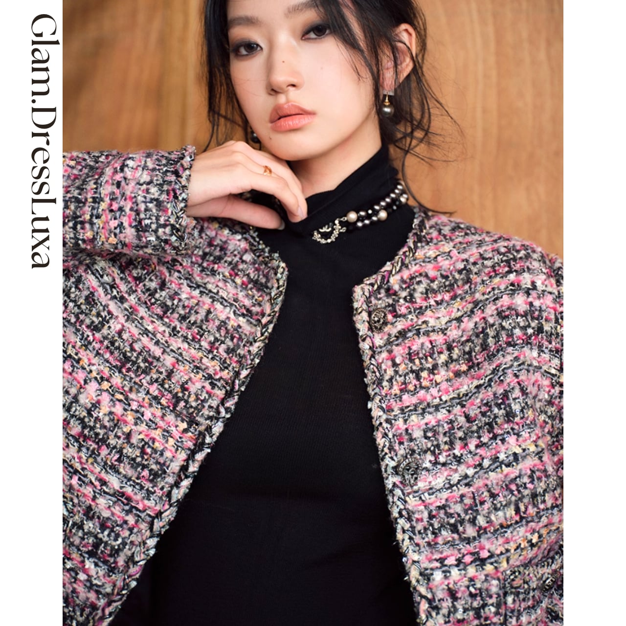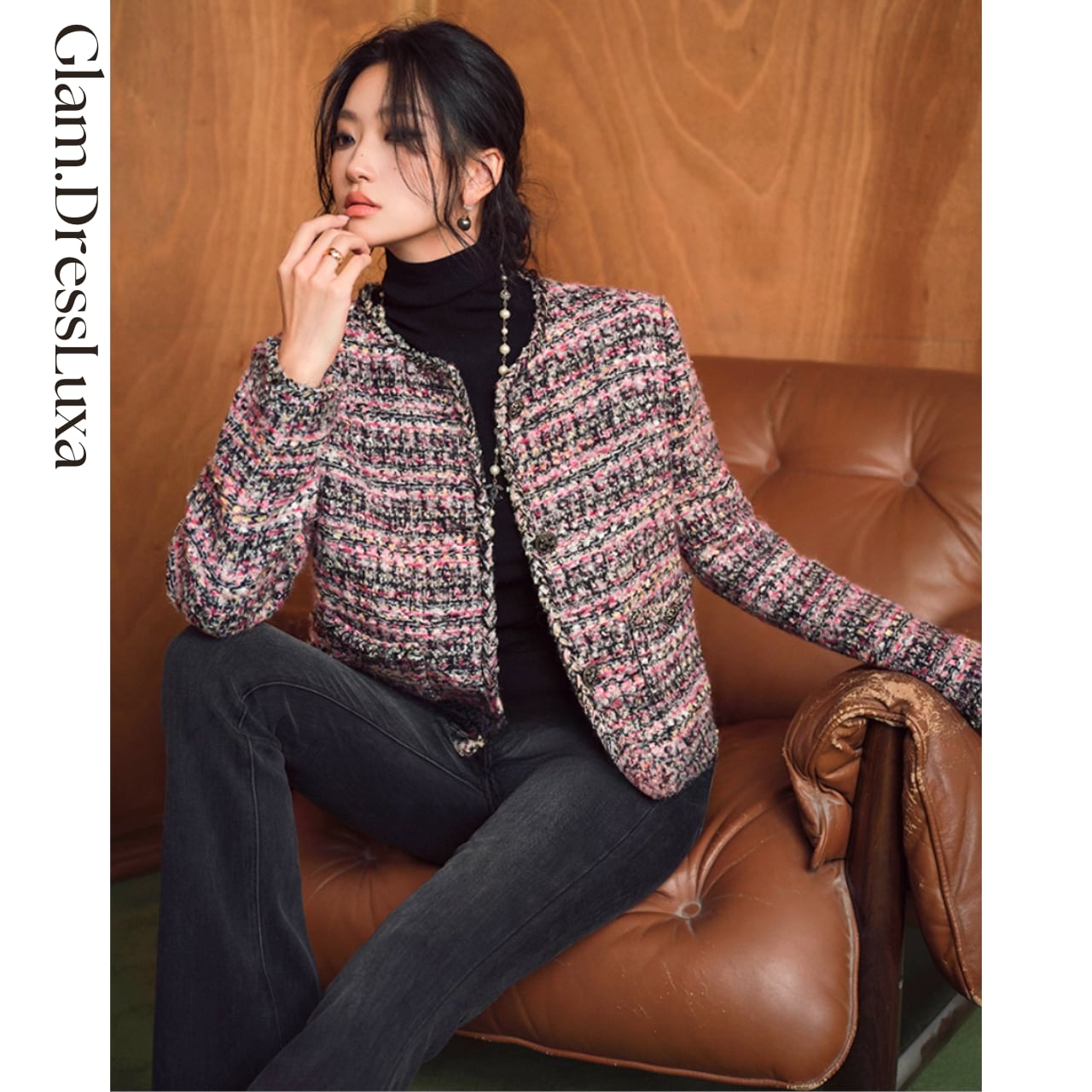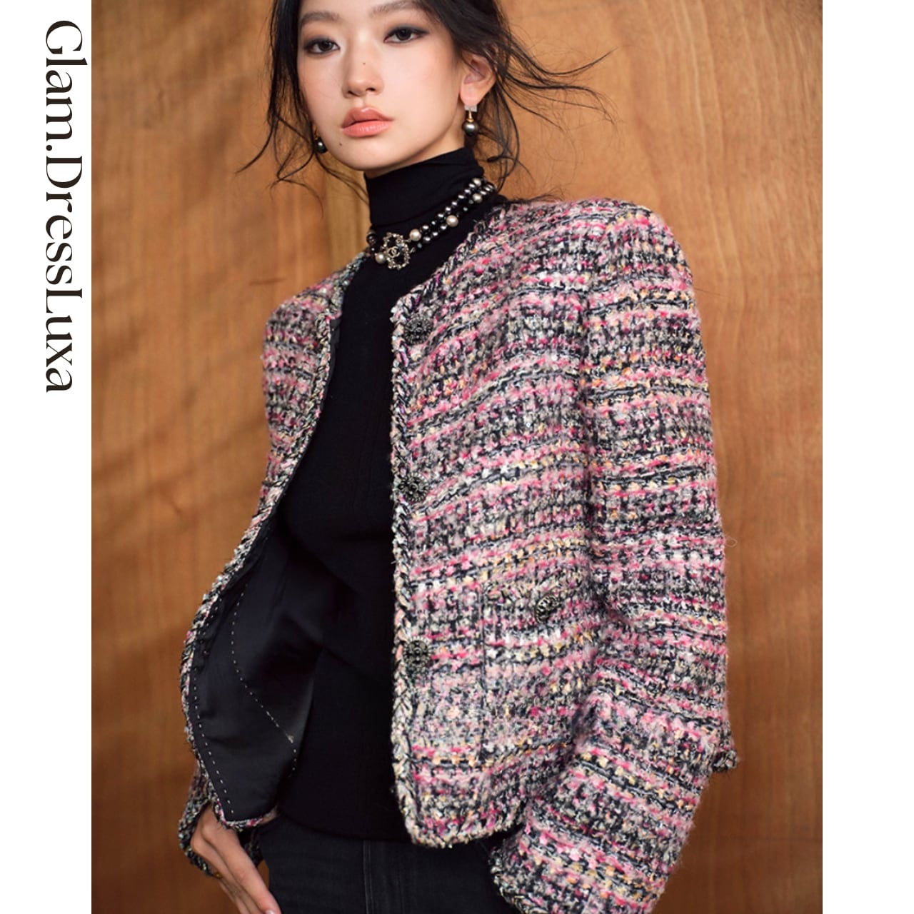 ・上質なツイード生地で仕立てた、クラシカルなノーカラージャケット。