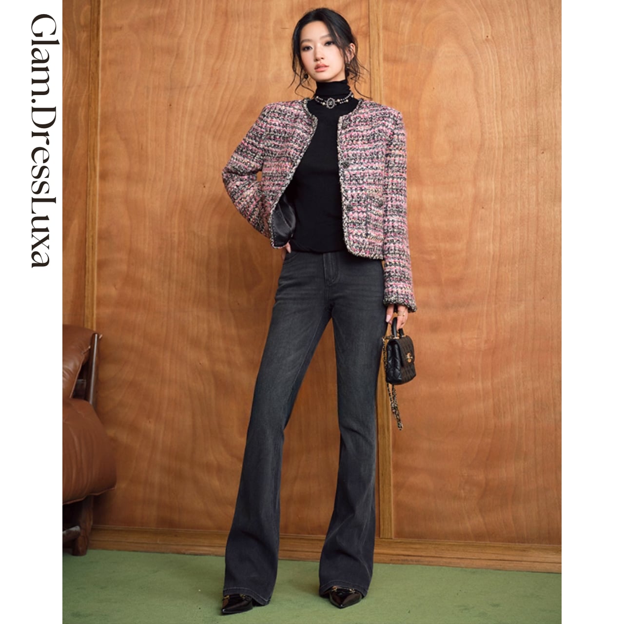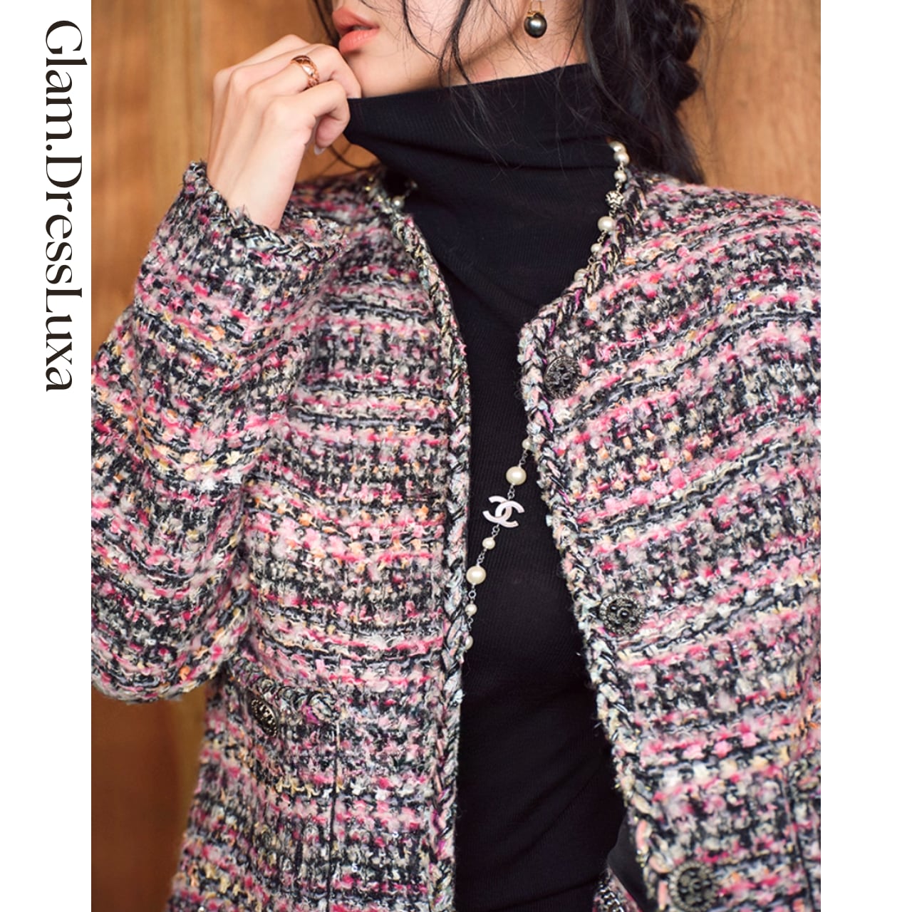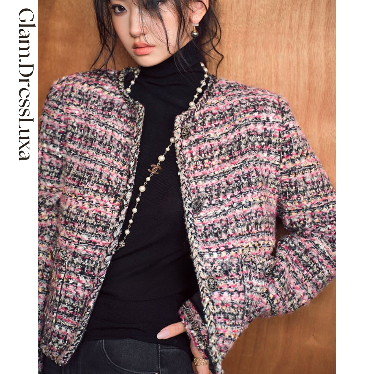 ・上質なツイード生地で仕立てた、クラシカルなノーカラージャケット。