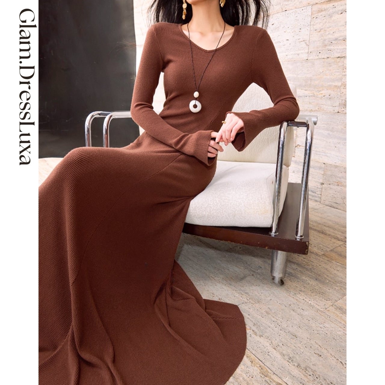 ・流れるようなマーメイドラインが女性らしさを引き立てるロングリブニットドレス。