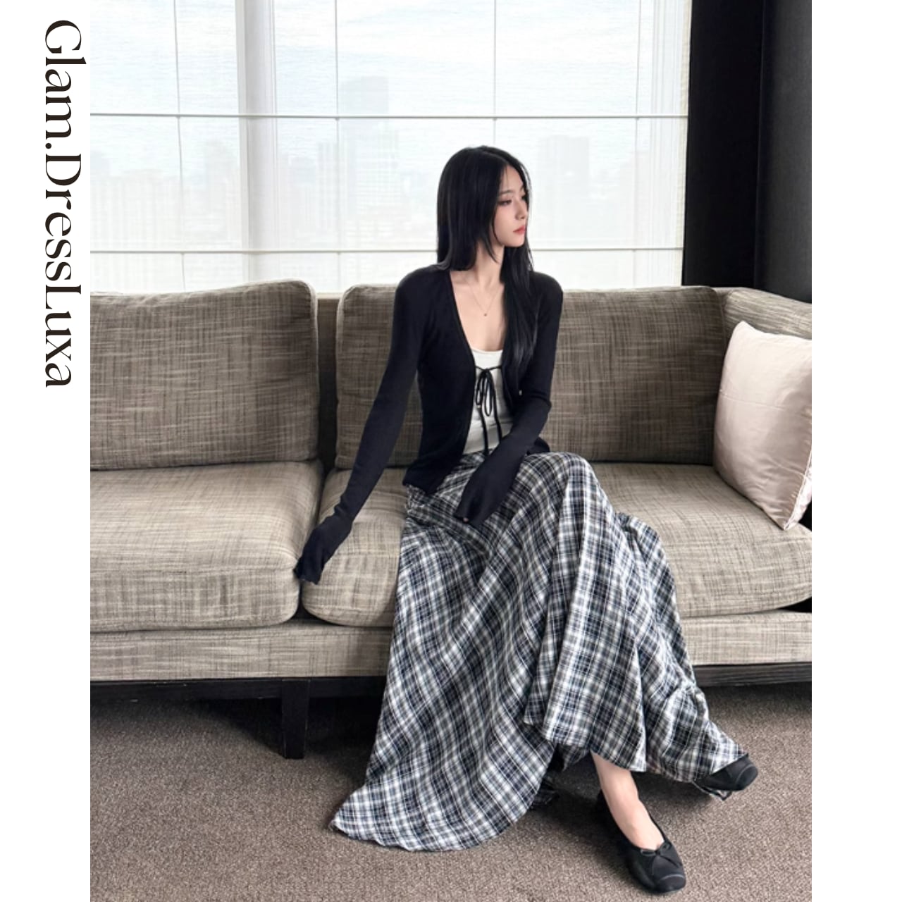 ・白黒のクラシカルチェックを、アシンメトリーな切り替えで表現したロングスカート。