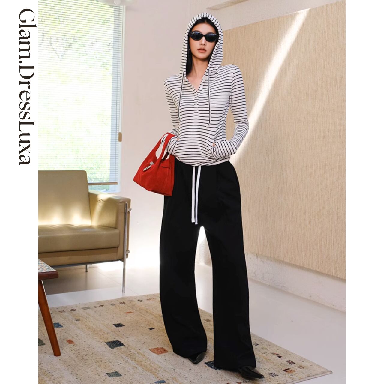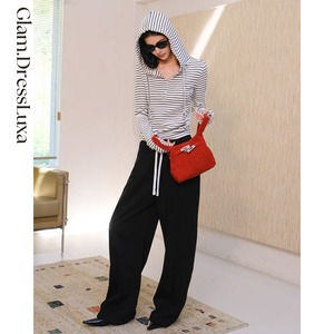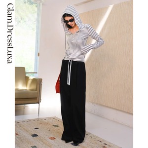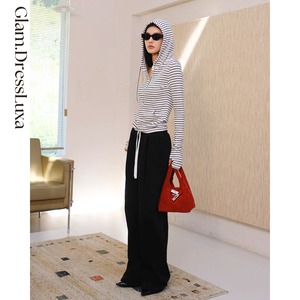 ・ふんわり柔らかな肌触りで心まで包み込む、ストライプ柄のニットフーディートップ。
