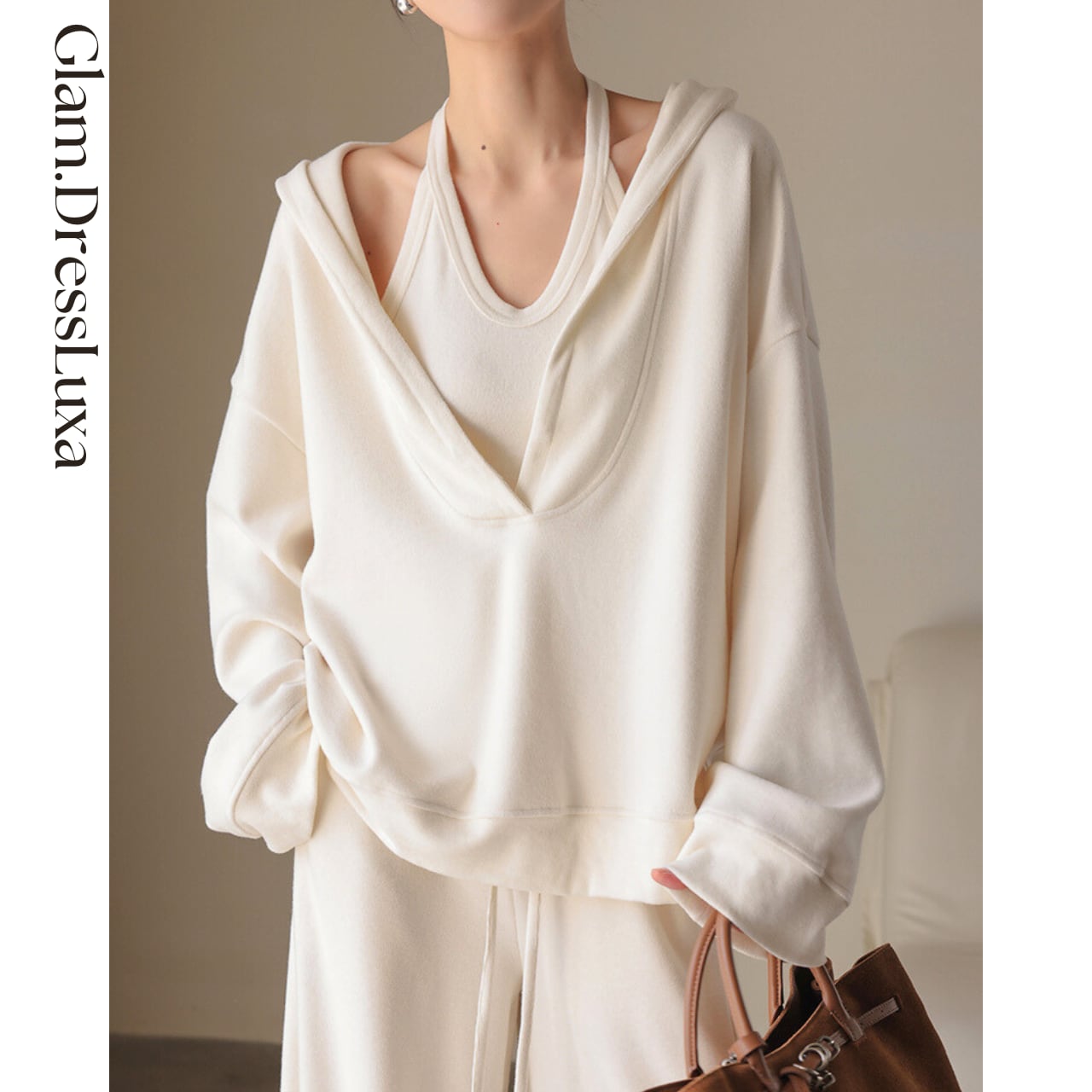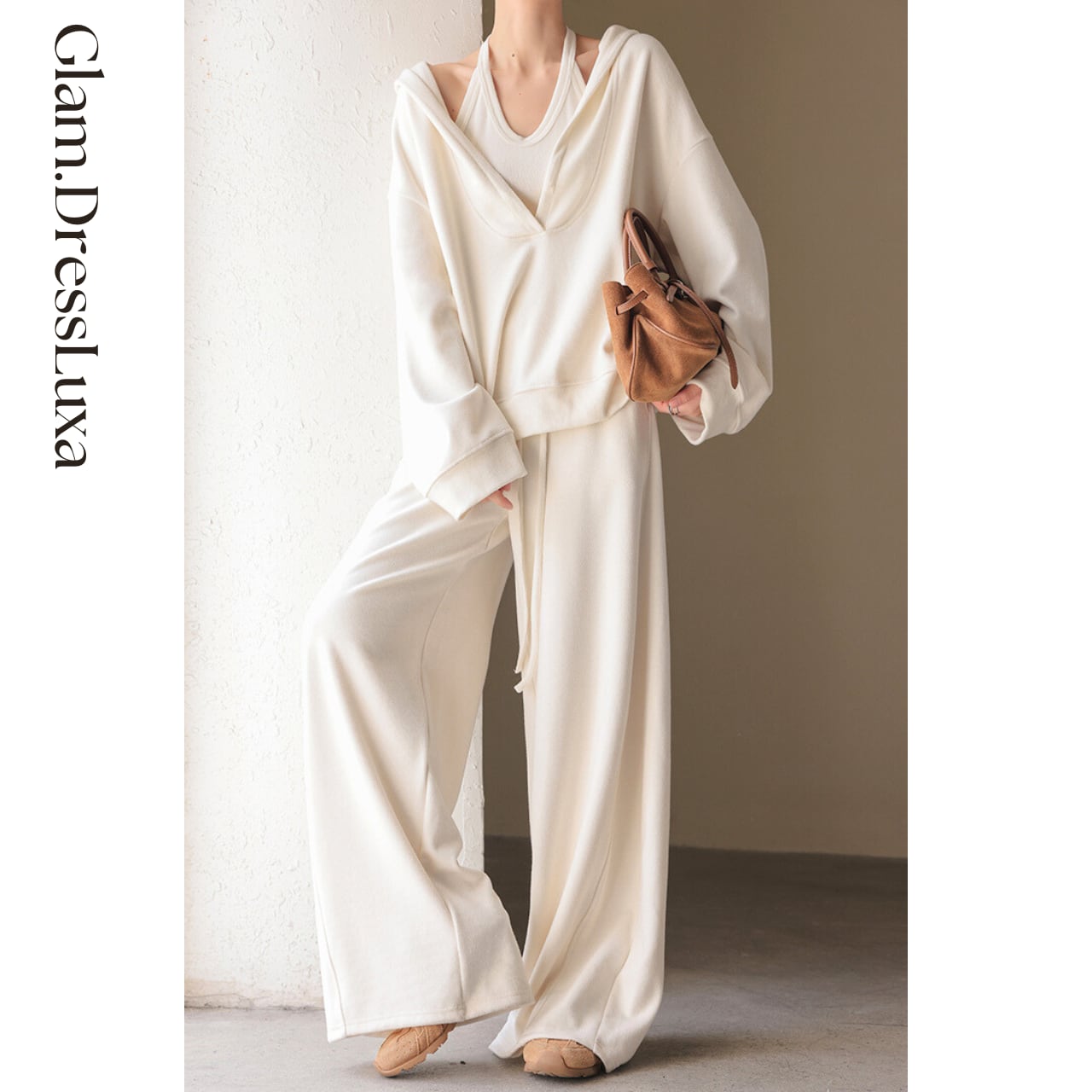 ・ホルターネックのインナー、ゆるシルエットのトップス、ワイドパンツの3ピースセット。