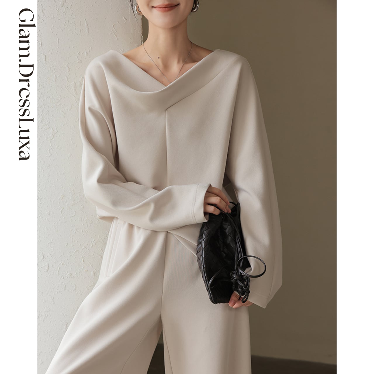 ・ゆるやかなドレープが美しいネックラインを描く上品なセットアップ。