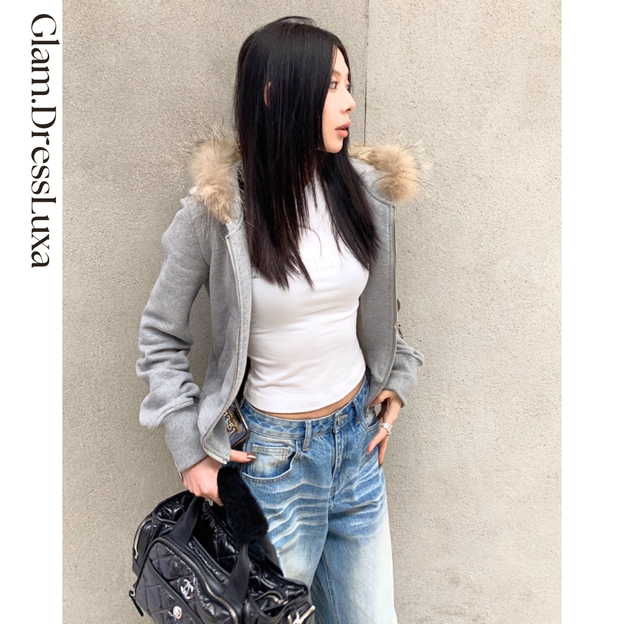 ・ボリュームのあるフェイクファーフードが目を惹くジップパーカー。