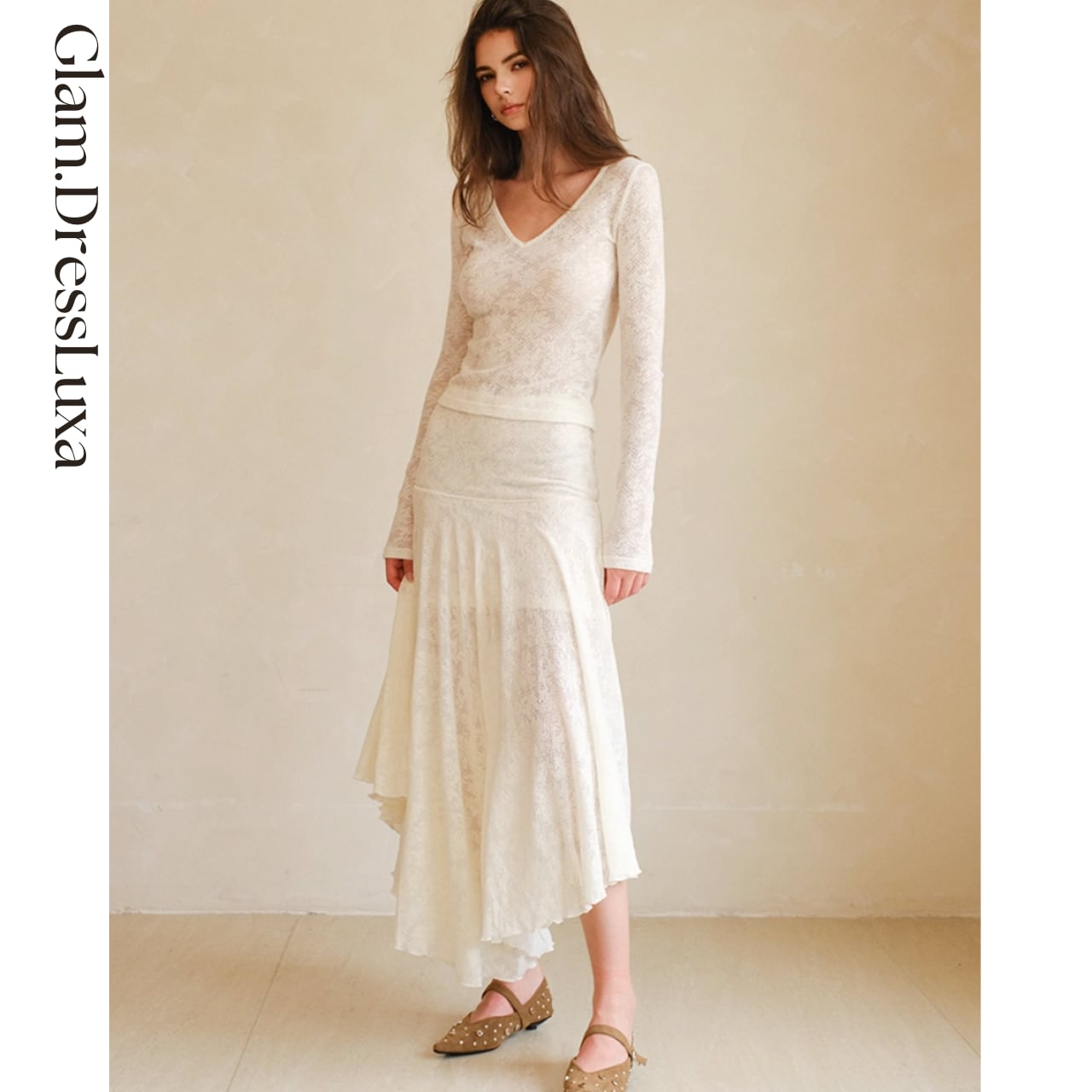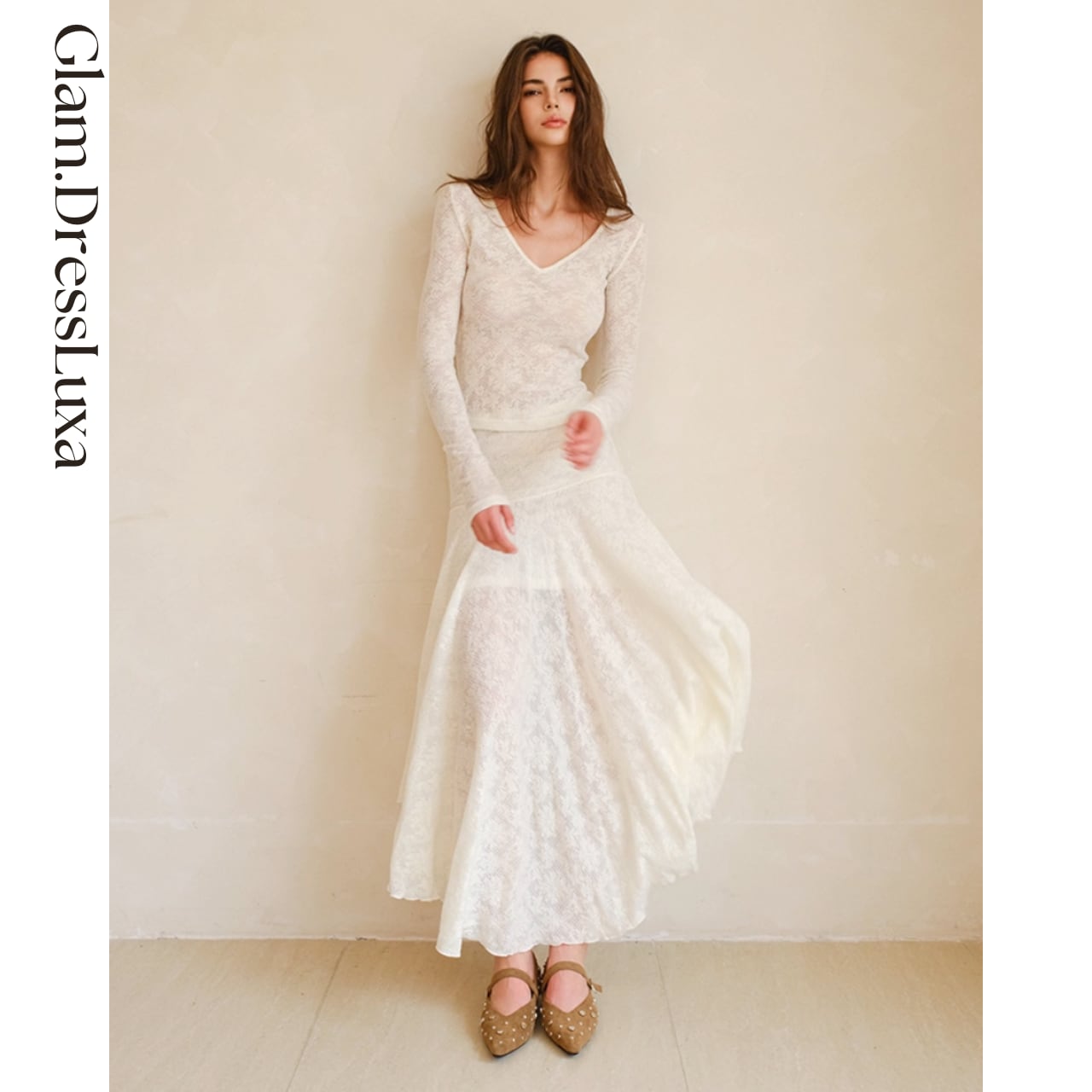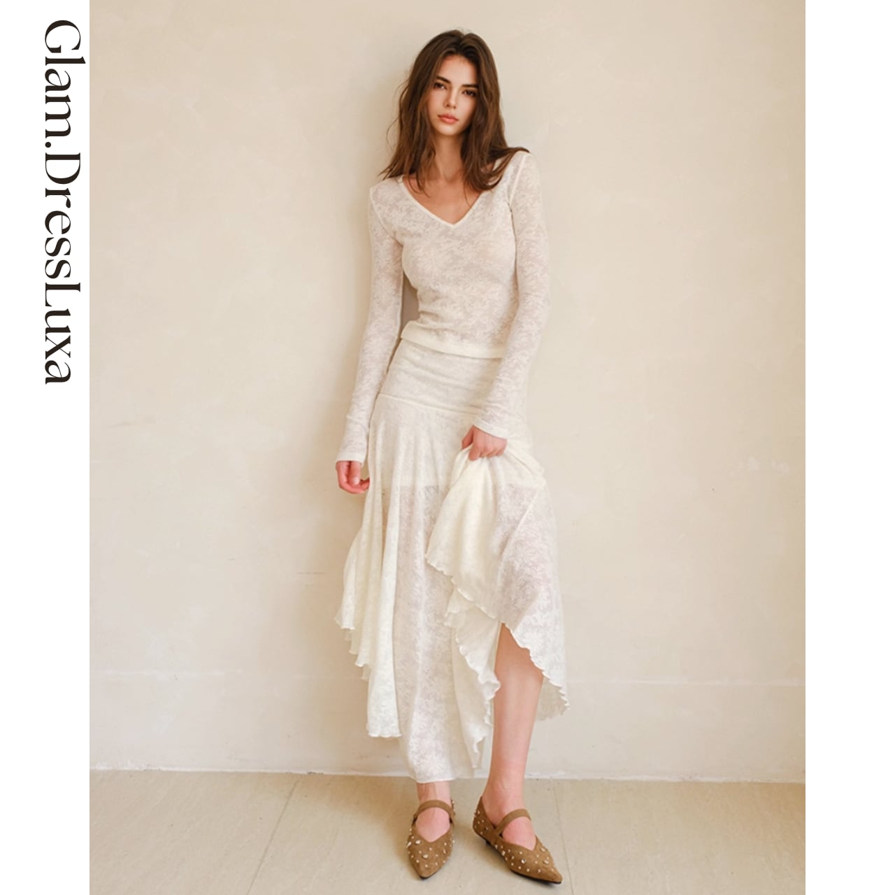 軽やかな透け感と柔らかな落ち感が美しく、歩くたびに上品な揺れを演出します。