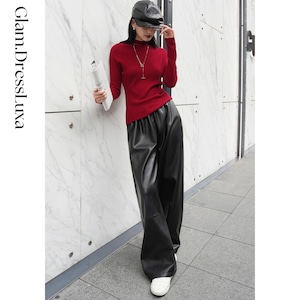 ・柔らかくマットな質感のフェイクレザーが魅力のワイドパンツ。
