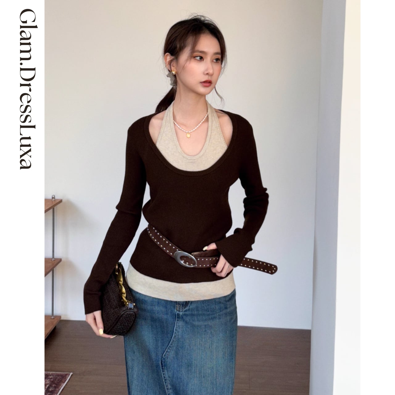 ・トレンドのフェイクツーピースデザインが魅力のレイヤードニットトップ。