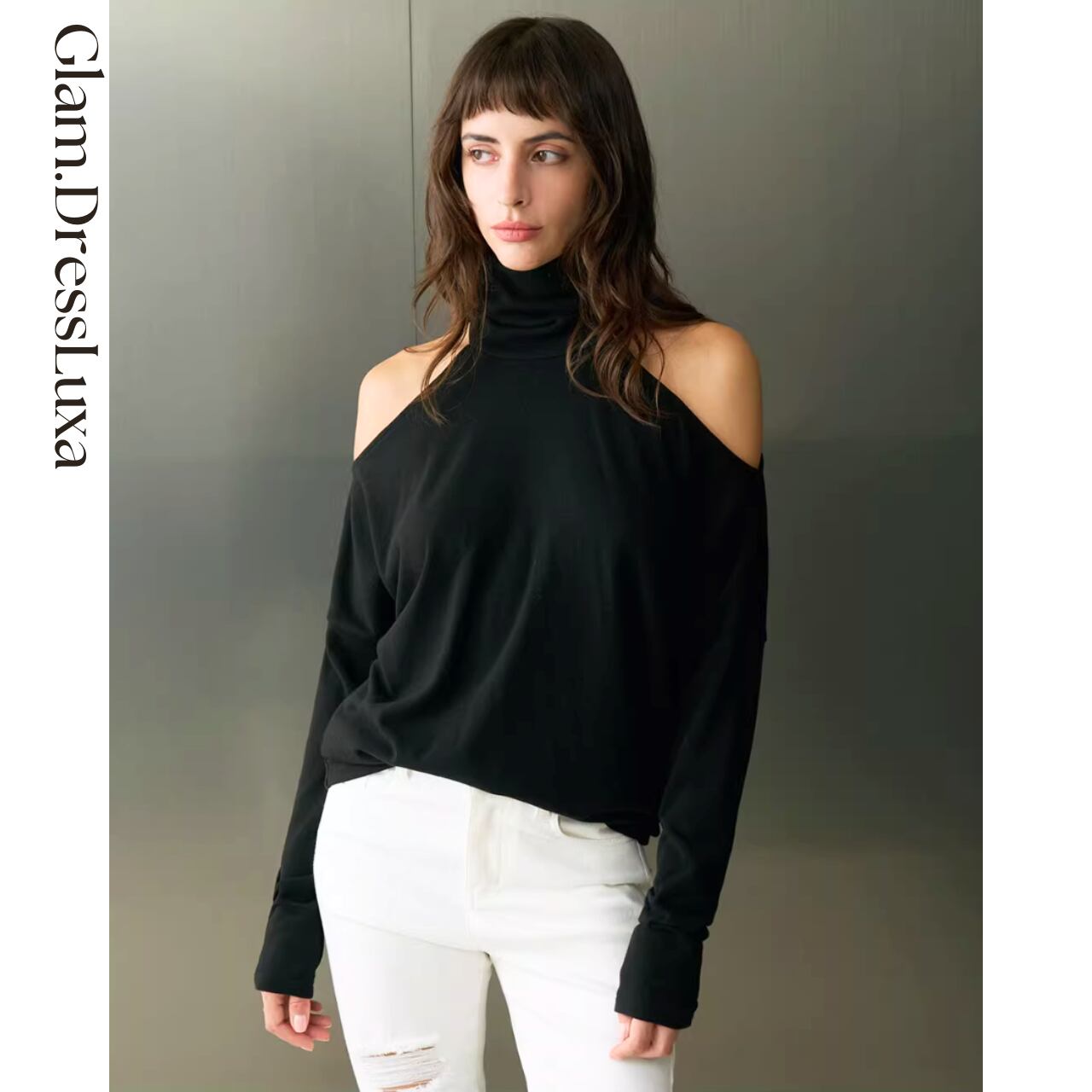 ・大胆な肩見せデザインが印象的なオフショルダータートルトップス。