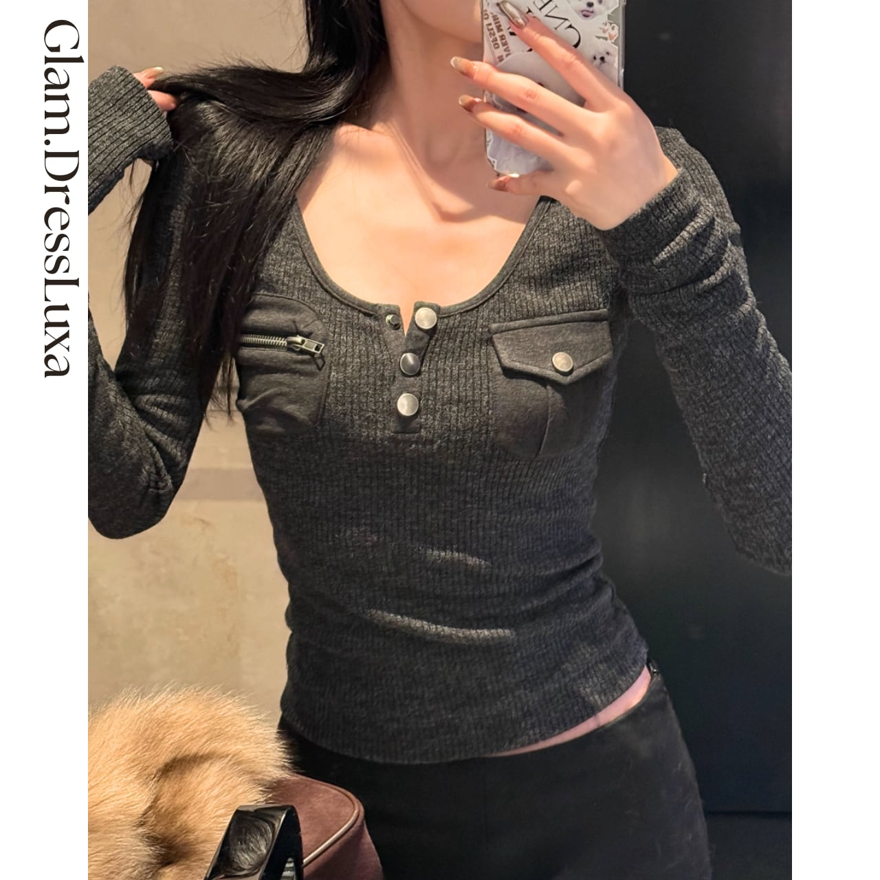 Metal Button Pocket Rib Cut Top/2color_T1634