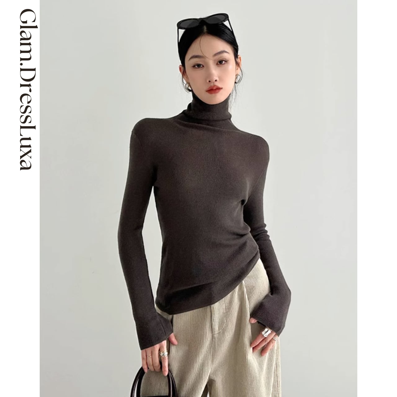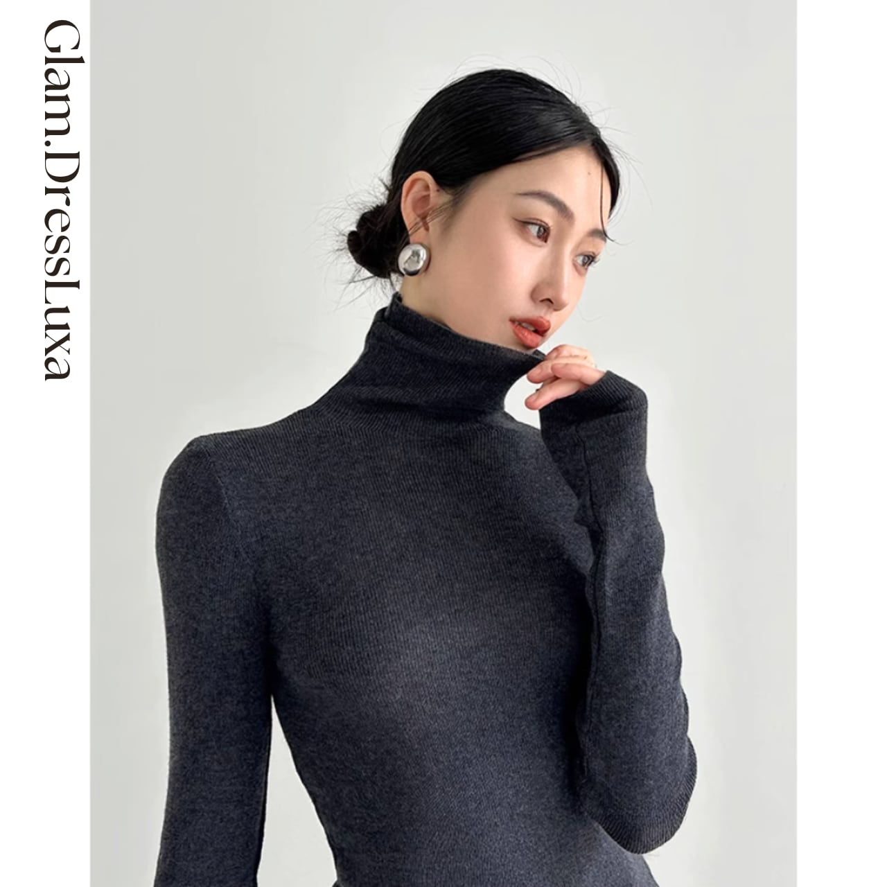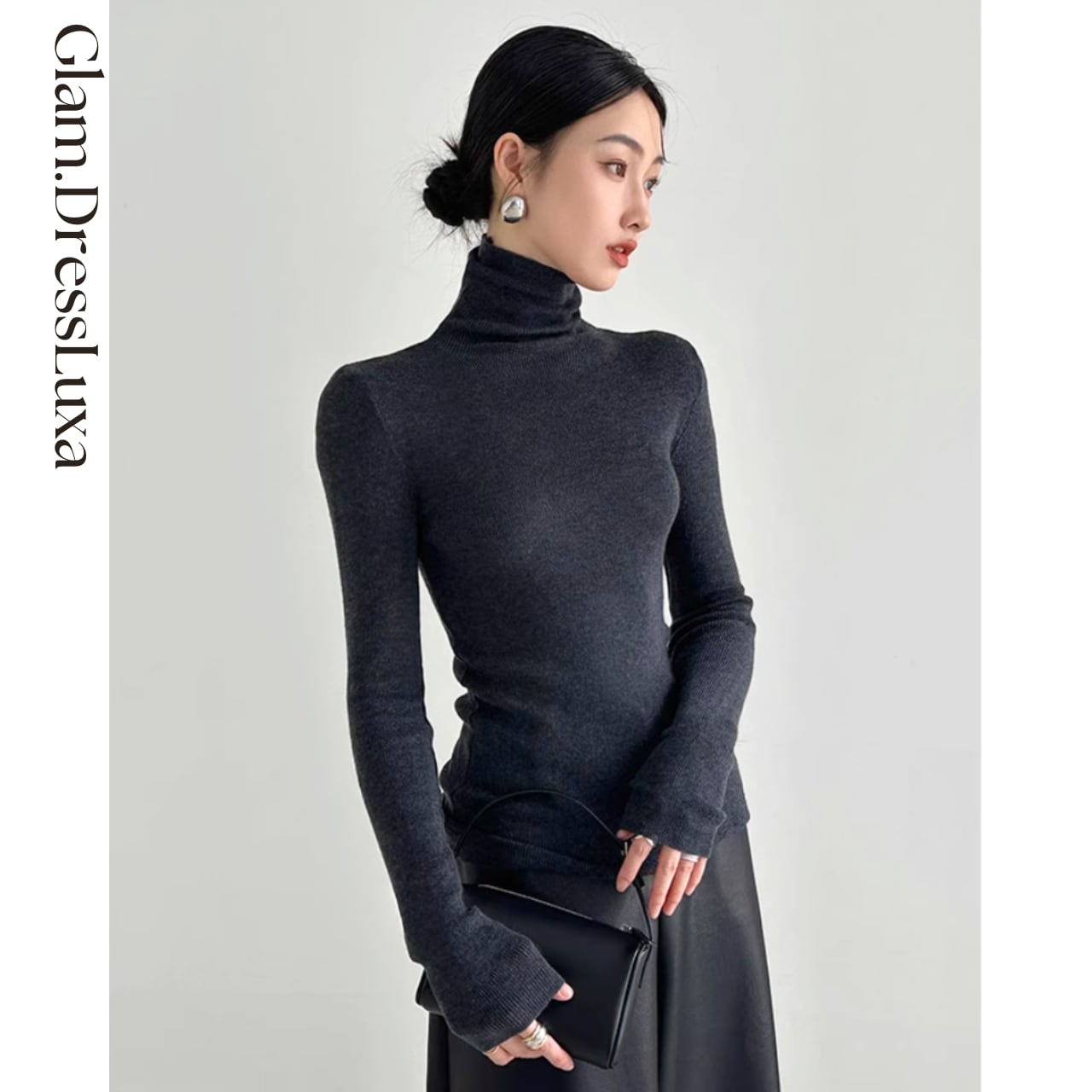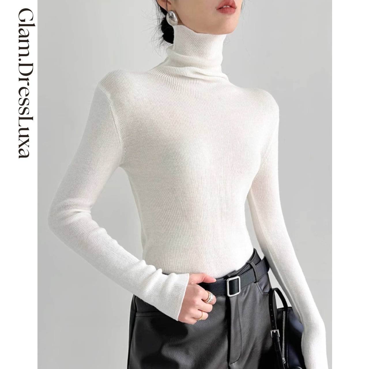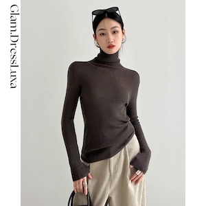 上品なハイネックデザインが首元をすっきりと見せ、どんなボトムとも相性抜群。