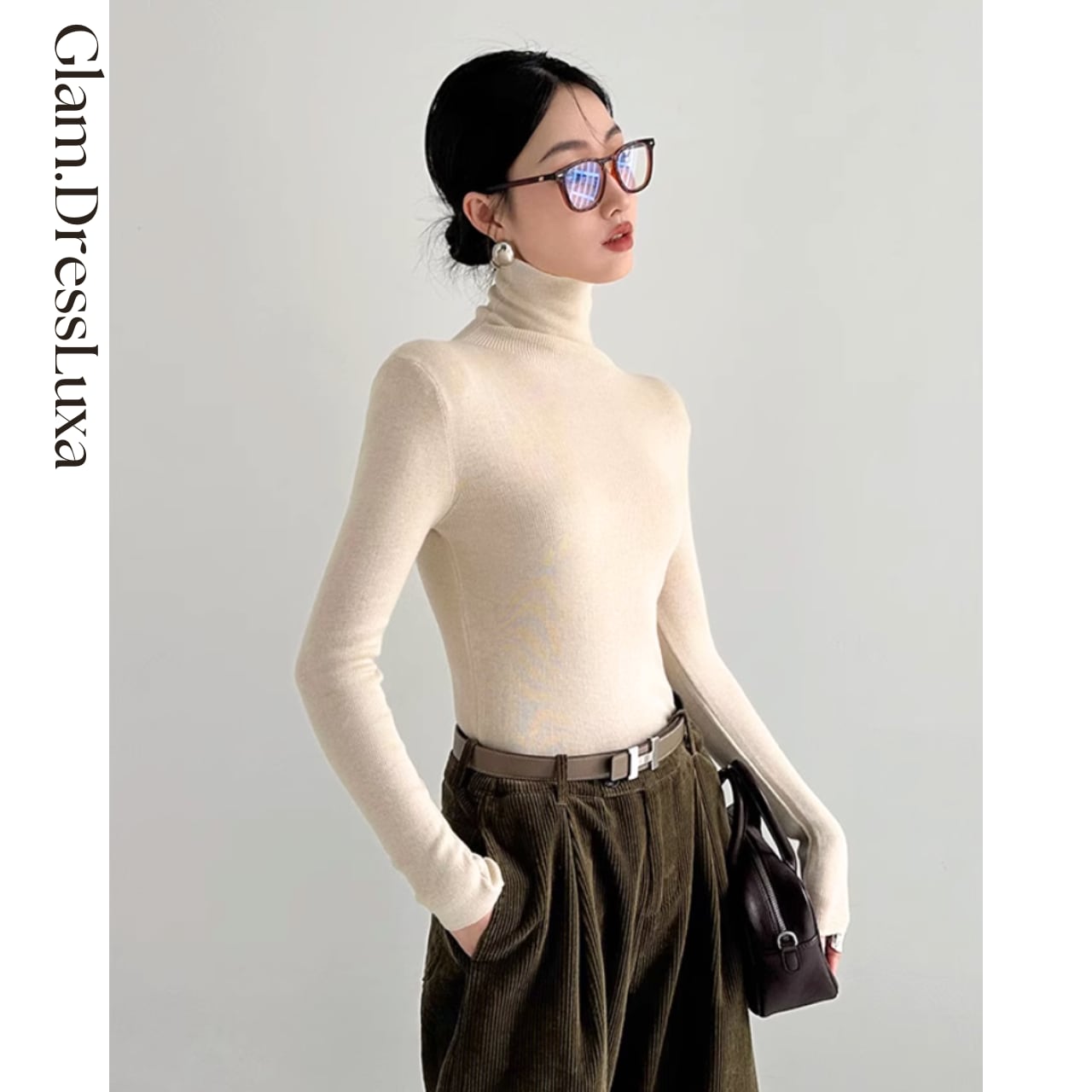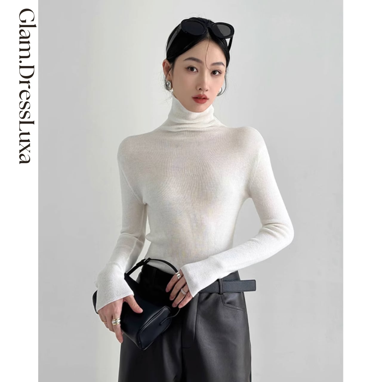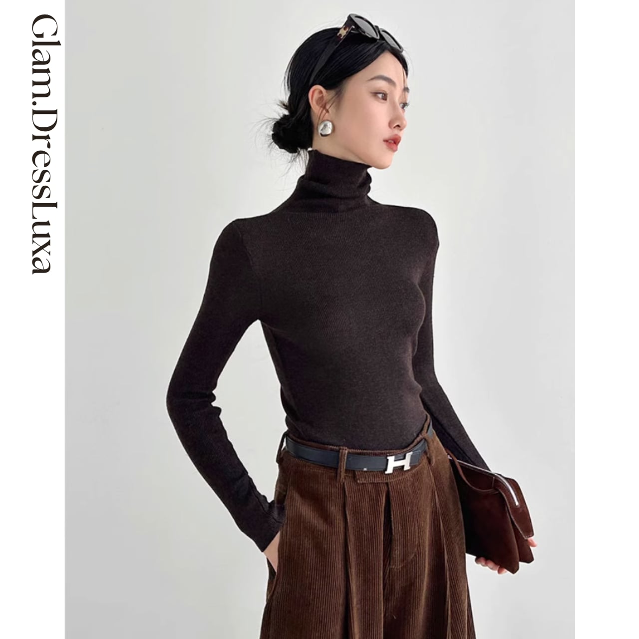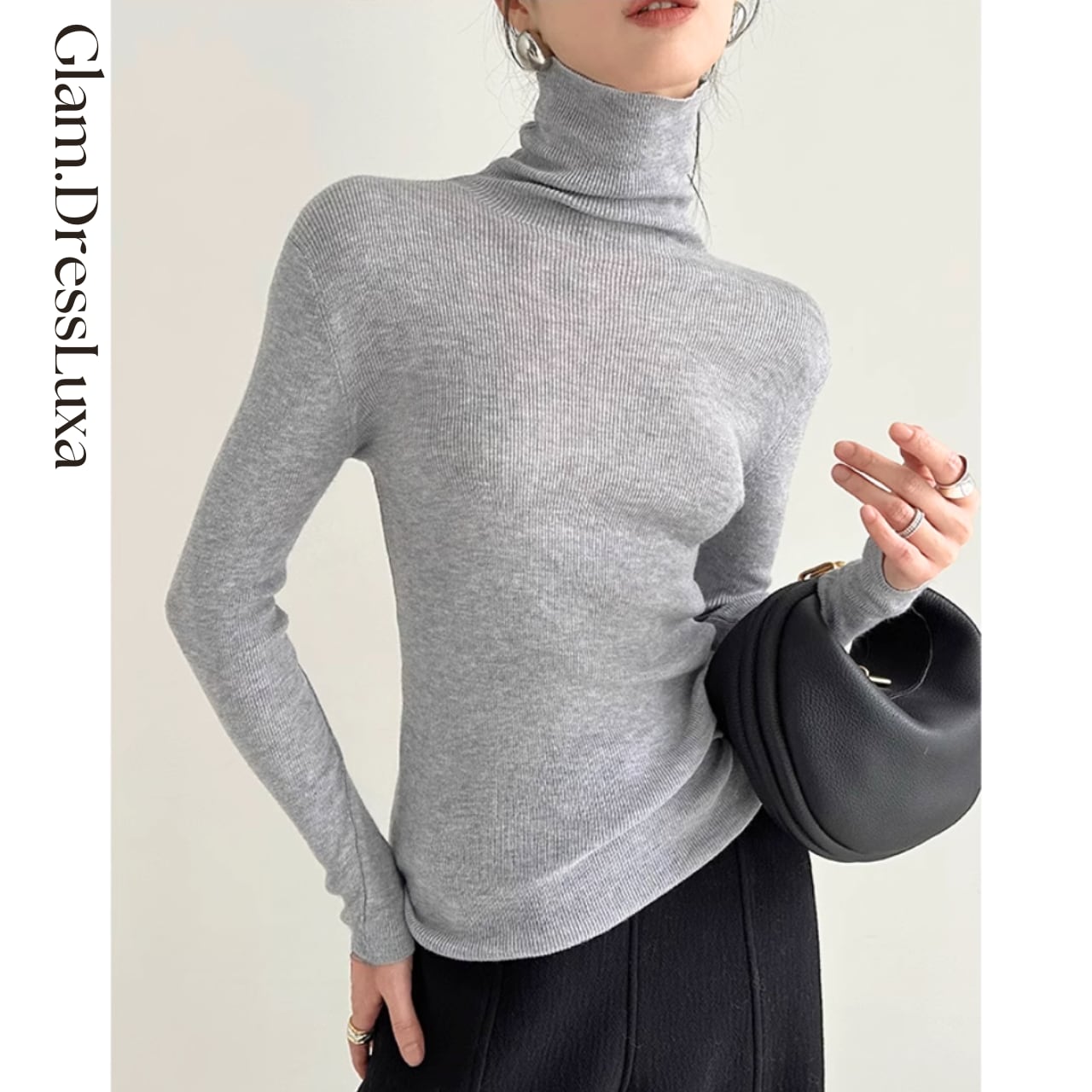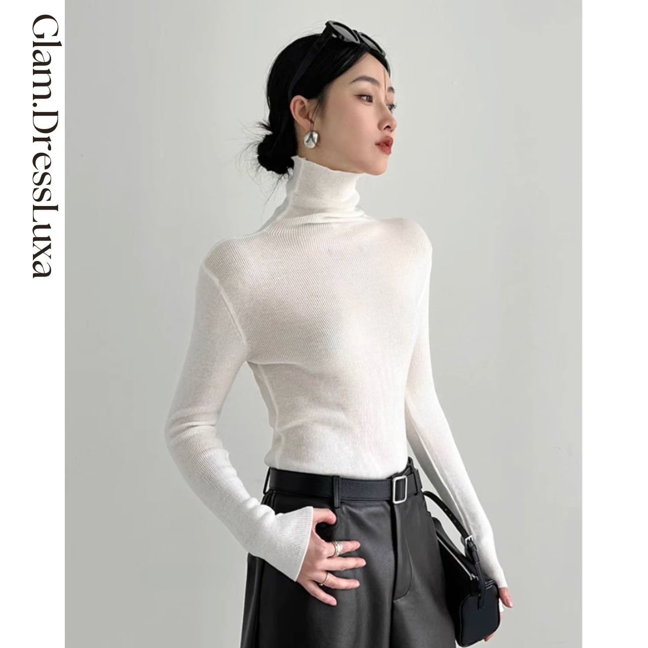 上品なハイネックデザインが首元をすっきりと見せ、どんなボトムとも相性抜群。