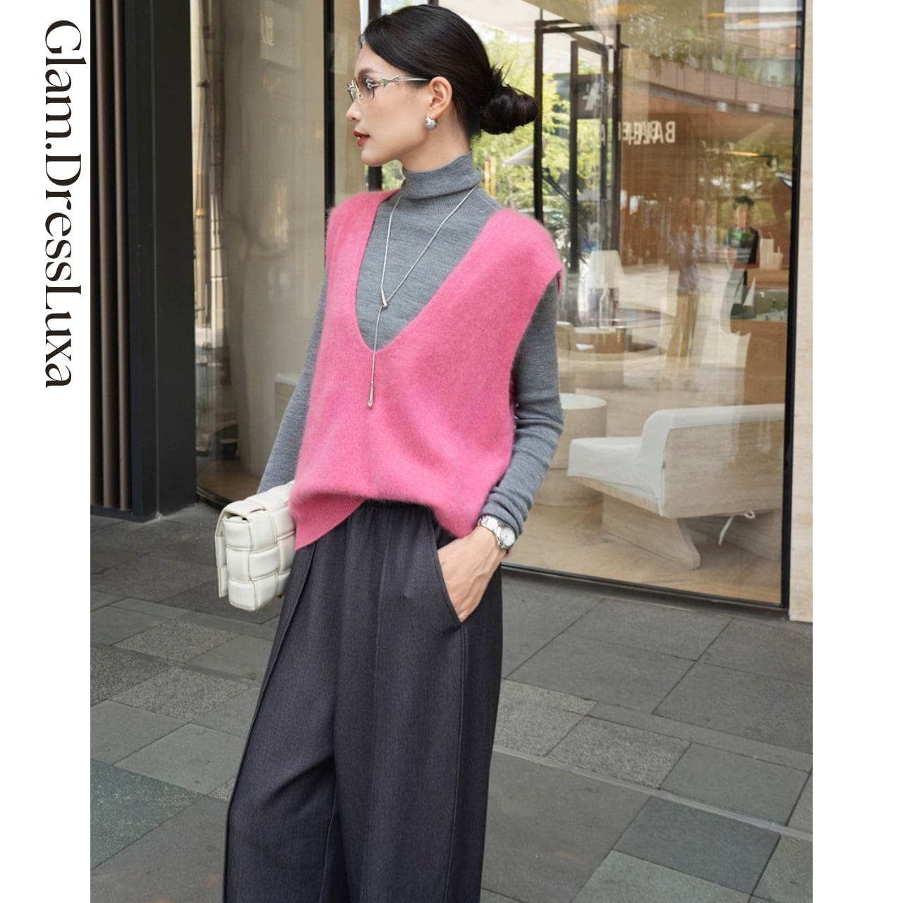 深めのVラインが首元をすっきり見せ、上品で大人な印象を演出します。