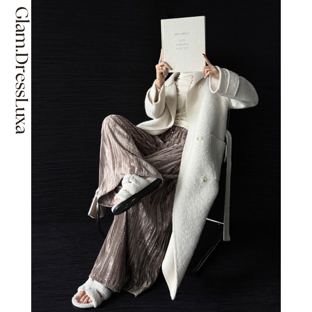 光の角度で表情が変わる柔らかな光沢素材が、スタイリングに深みをプラス。