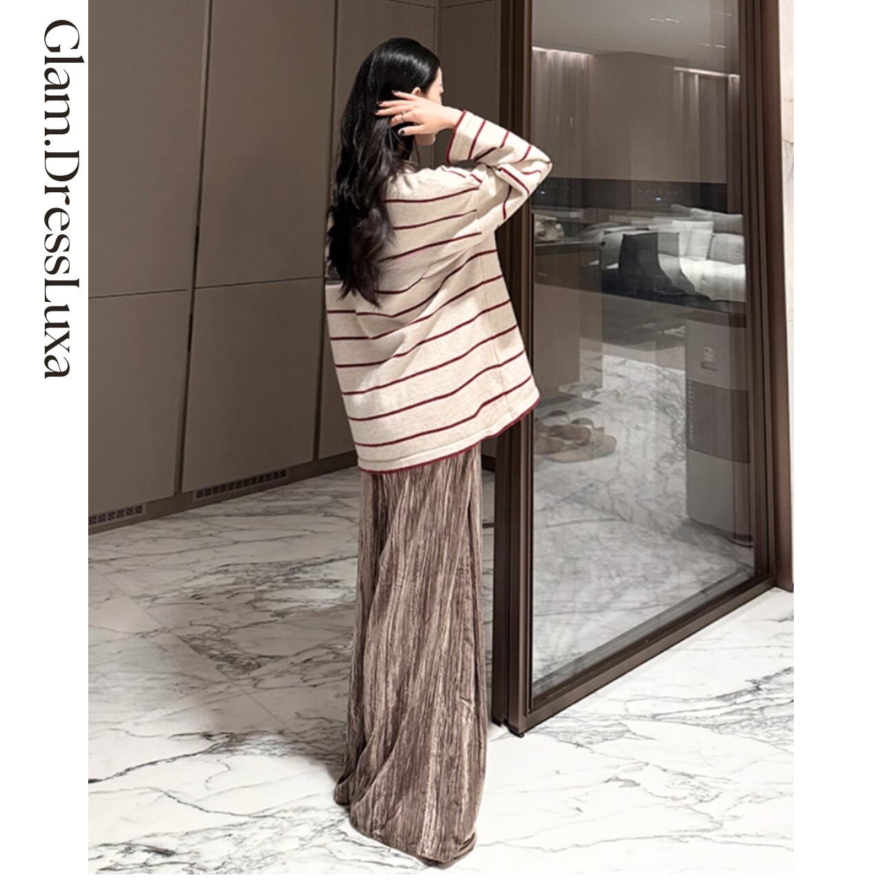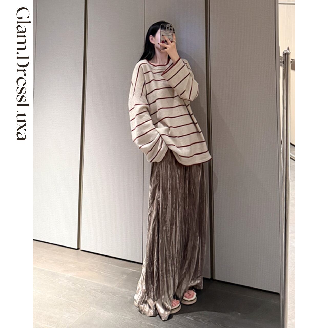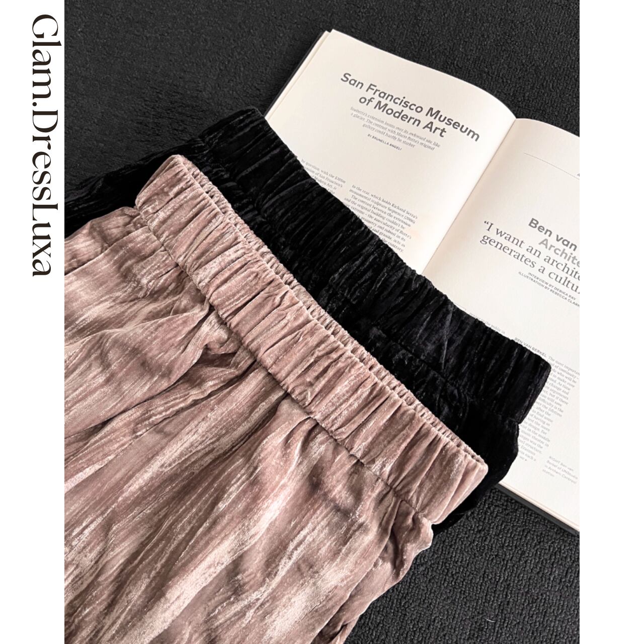 ・柔らかく滑らかなベルベット生地/光沢あり/ウエストゴム仕様/落ち感あり