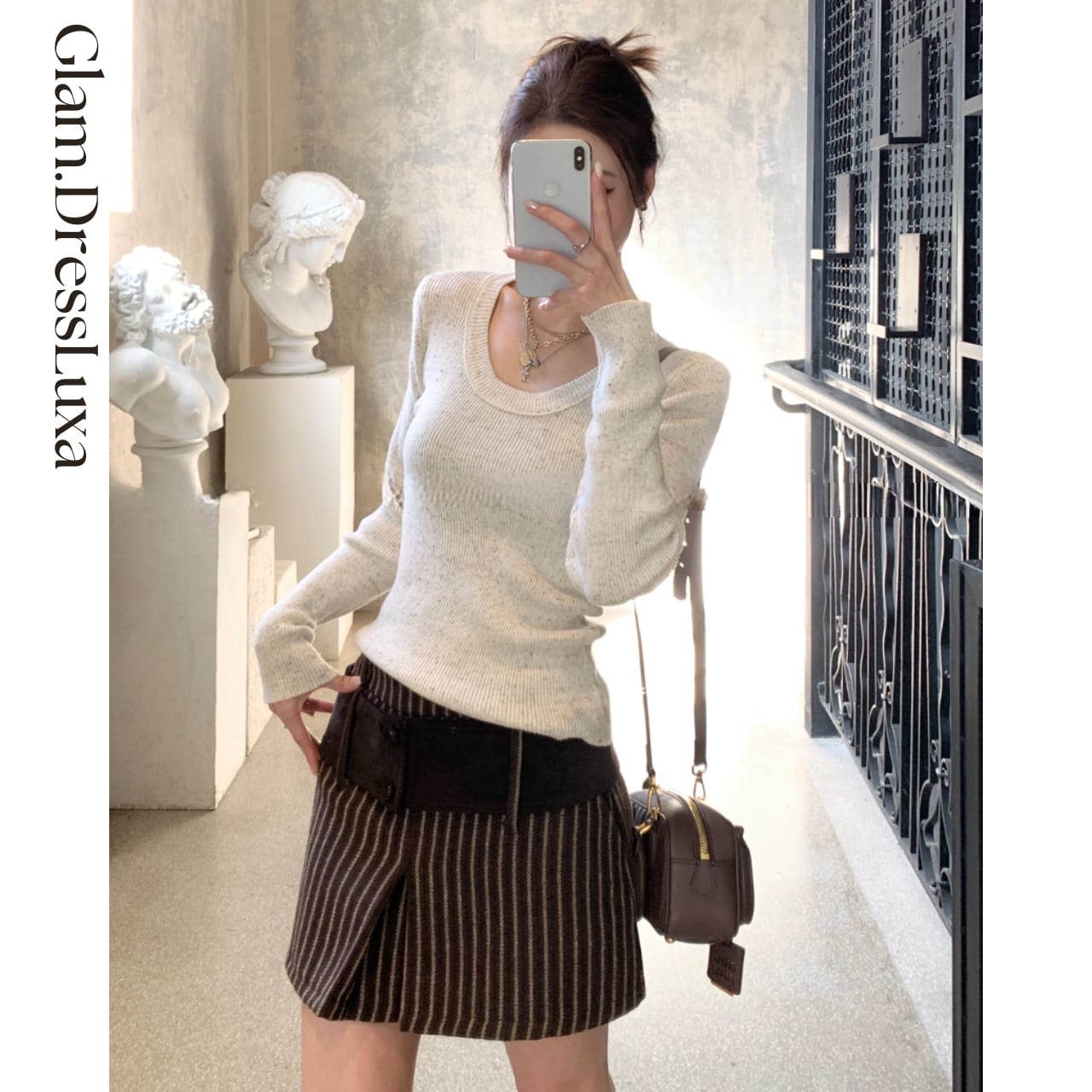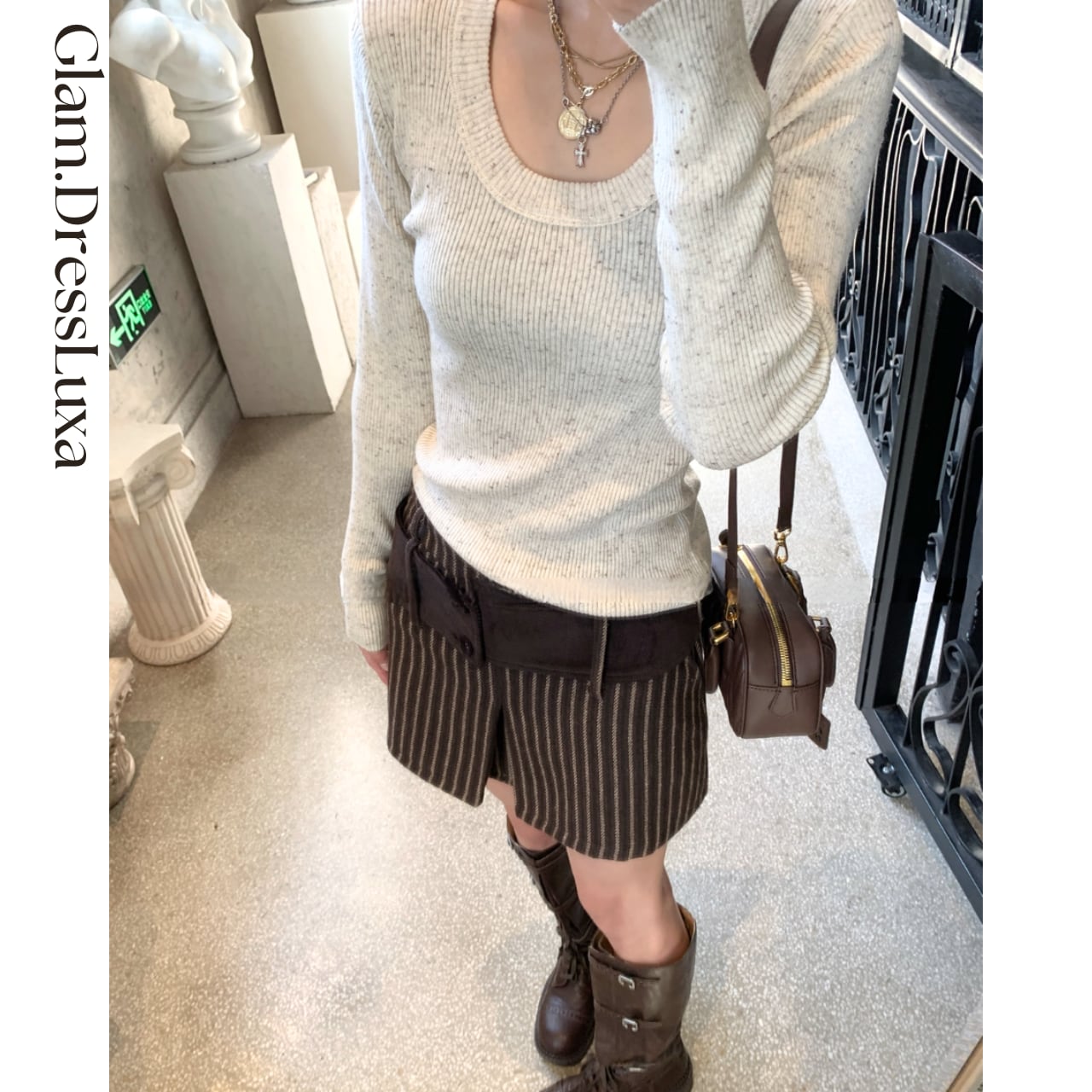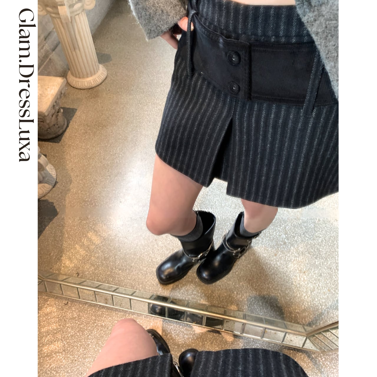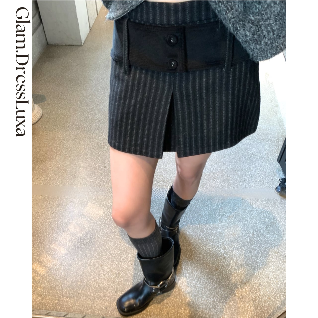 ・細かなストライプ柄に、太めのウエストデザインを添えたミニスカート。