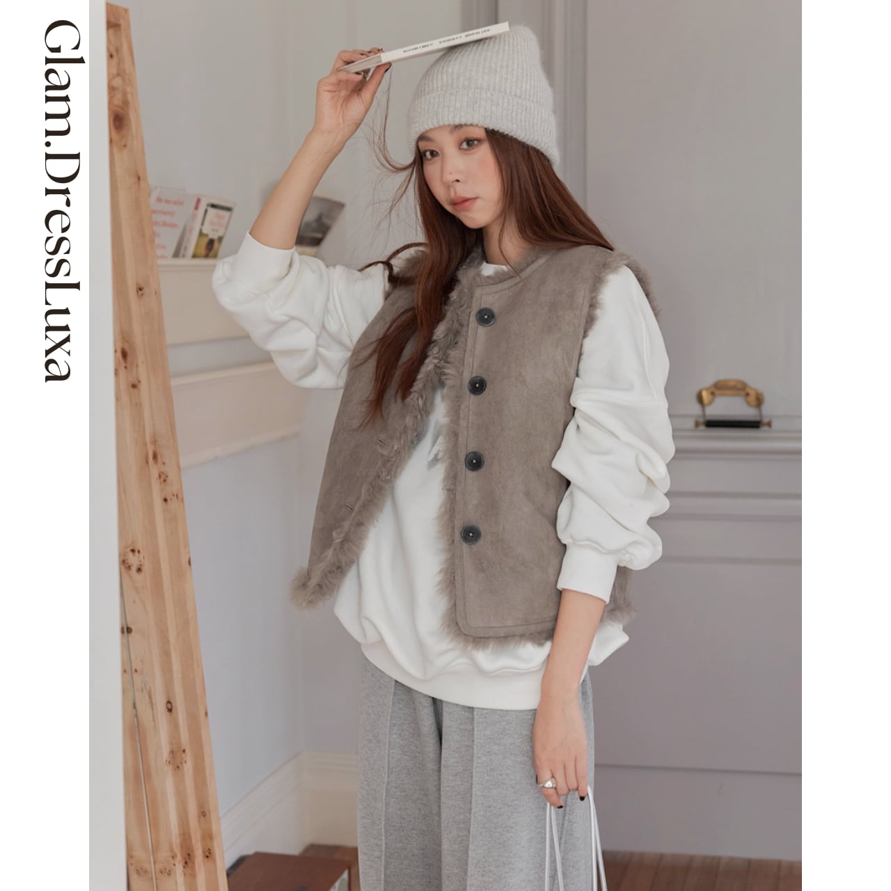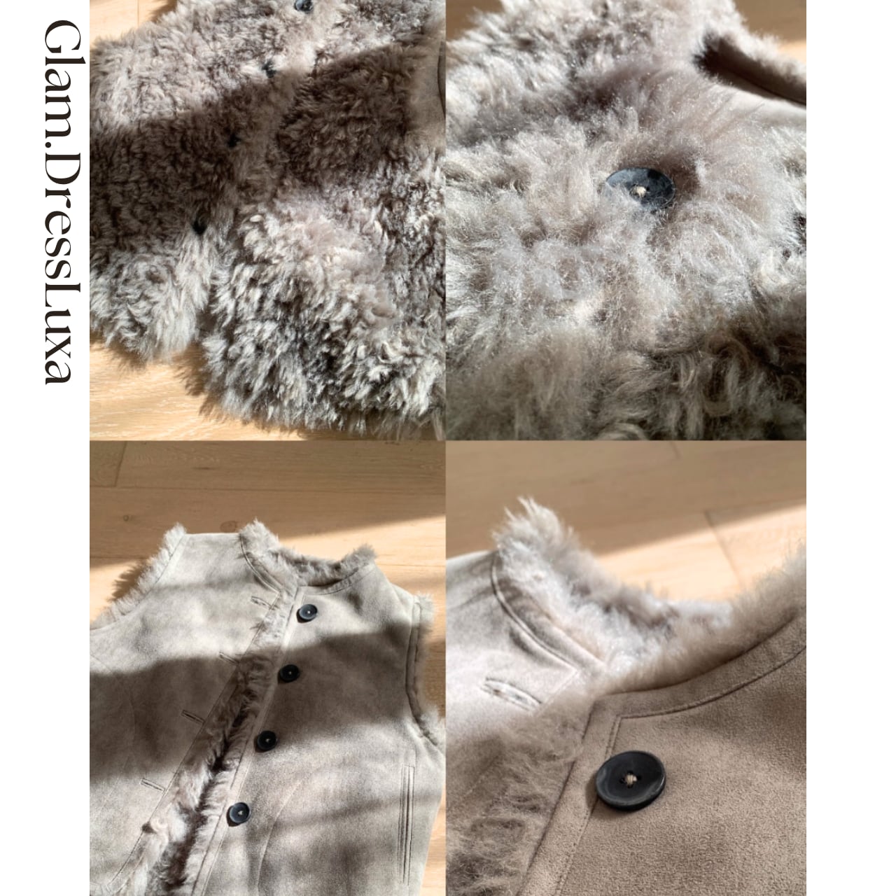 ・ふんわりとしたフェイクファーとスエードタッチの面を楽しめる、リバーシブル仕様のベスト。