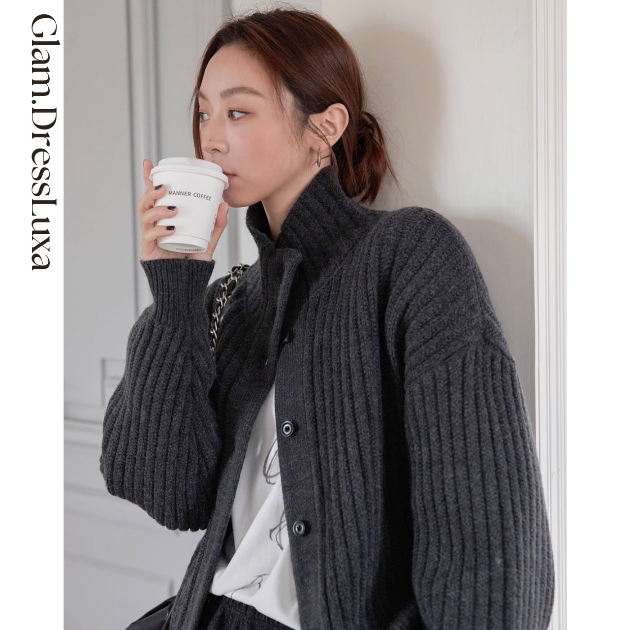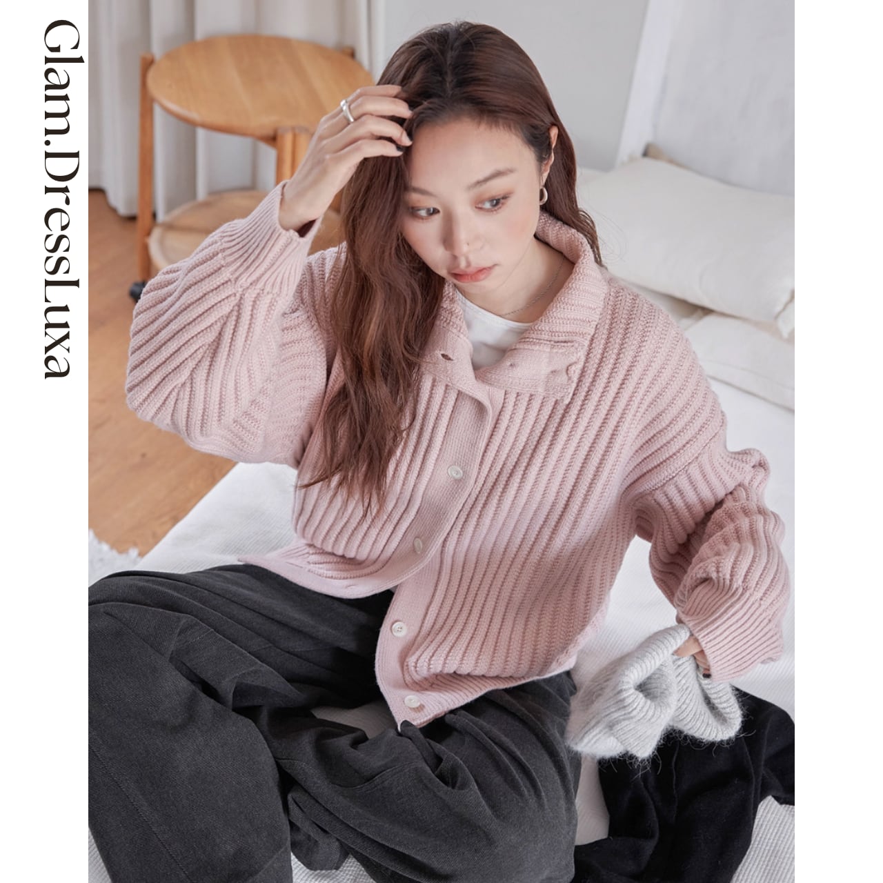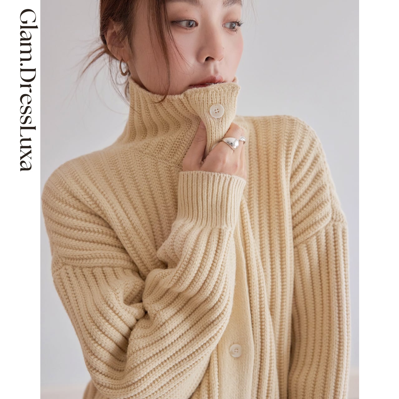 ・立体感のあるリブ編みが魅力のハイネックカーディガン。