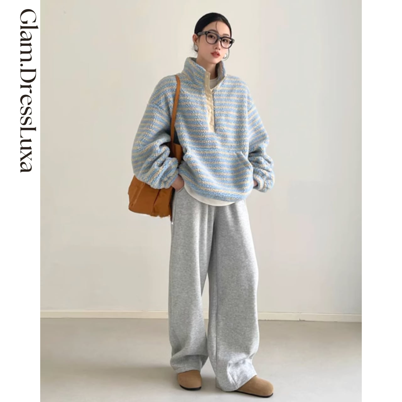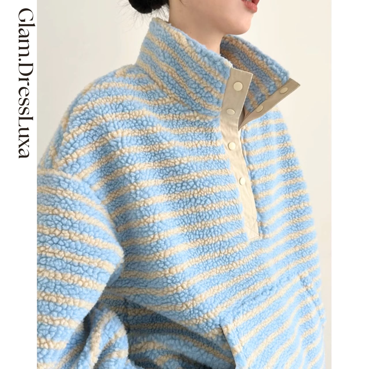 ・ふんわりとしたボリューム感と、優しい配色ストライプが魅力のフリースプルオーバー。