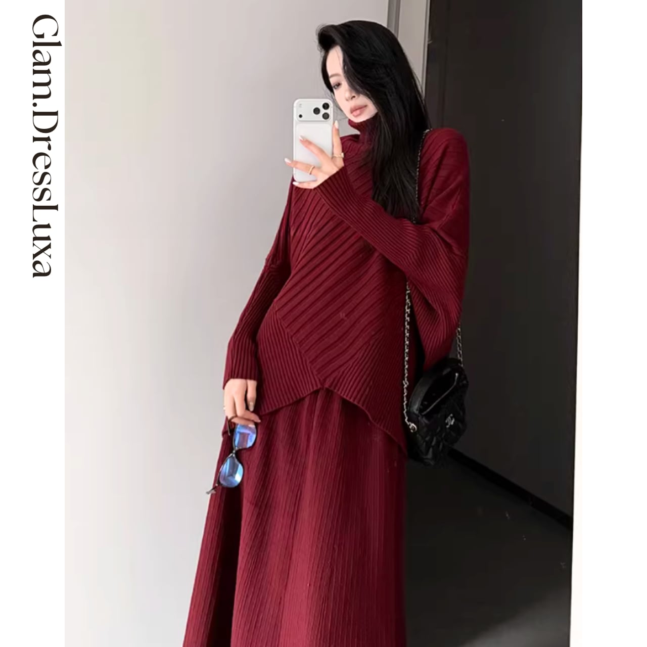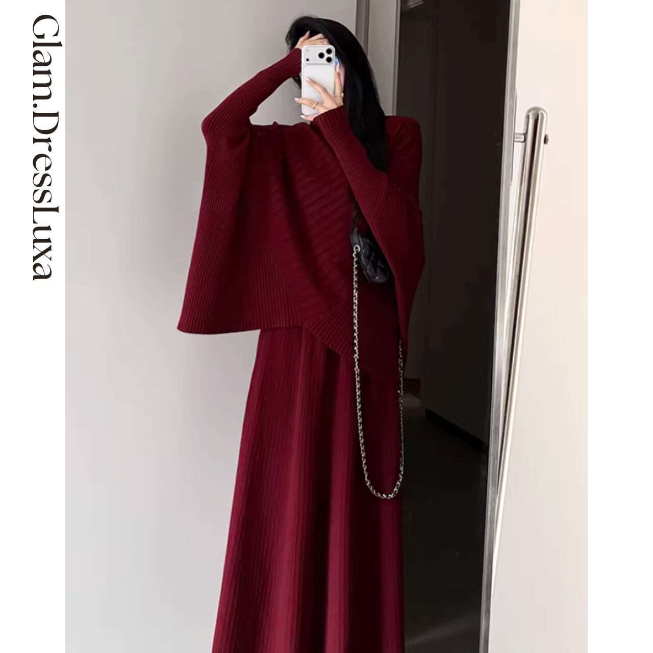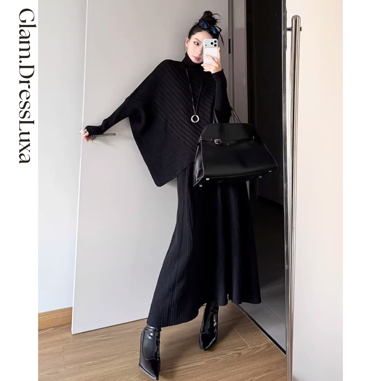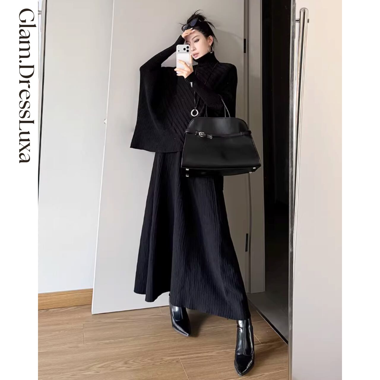 ・立体的なリブ編みとアシンメトリーなレイヤードデザインが印象的なニットセットアップ。