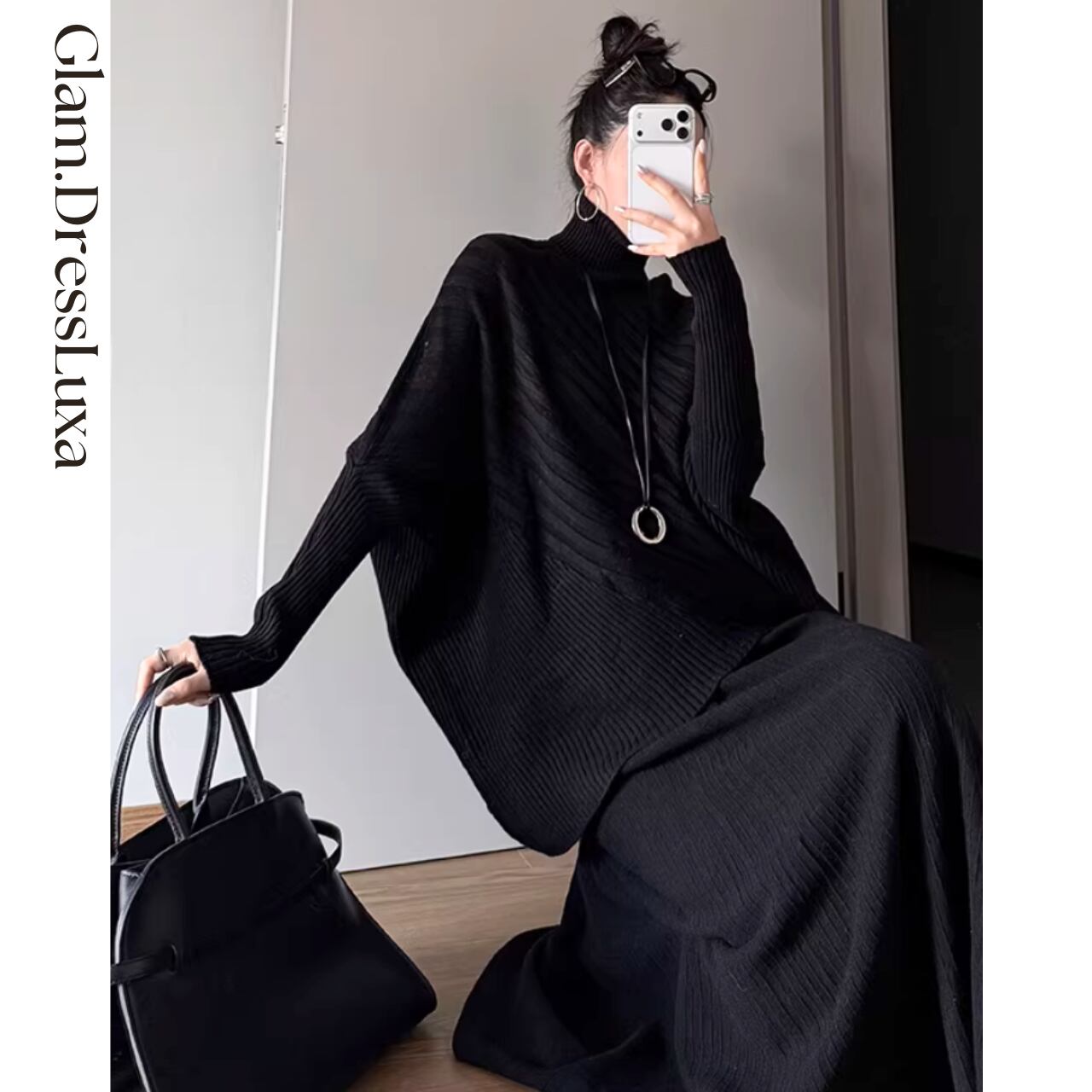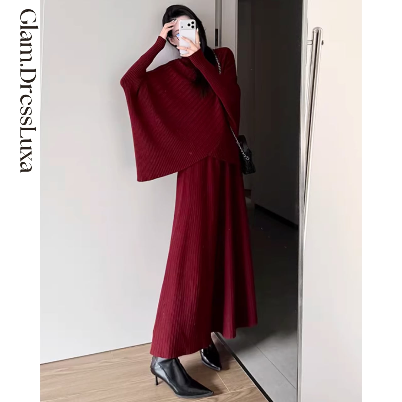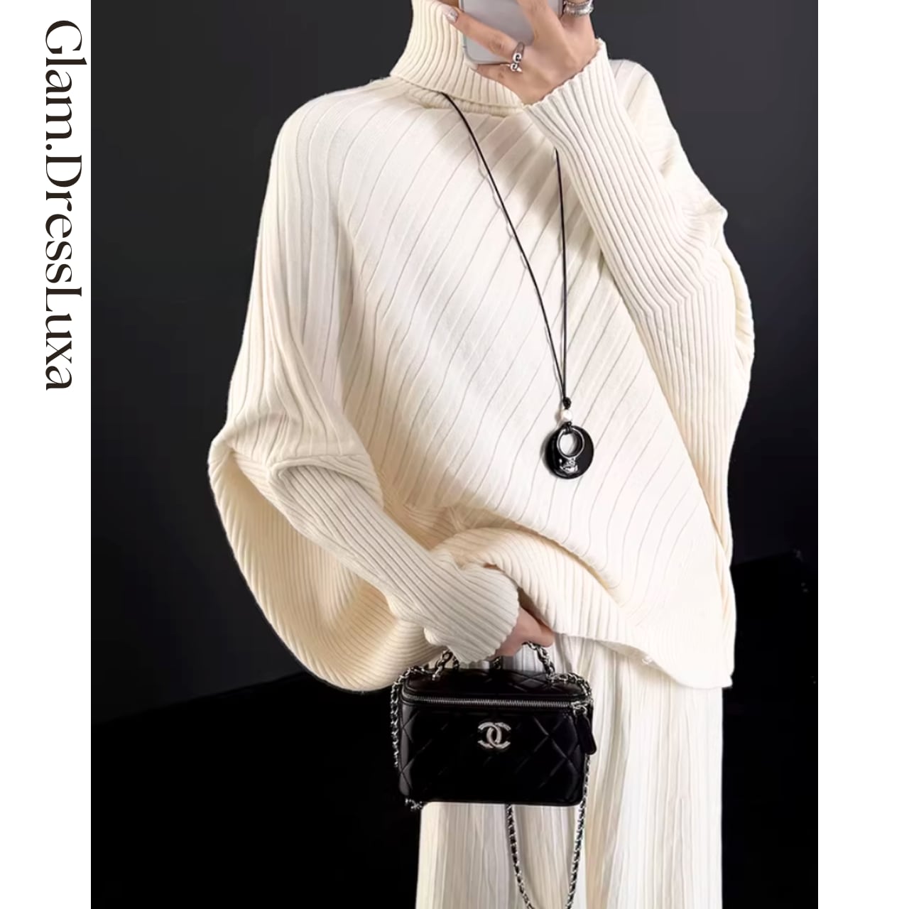 ・立体的なリブ編みとアシンメトリーなレイヤードデザインが印象的なニットセットアップ。