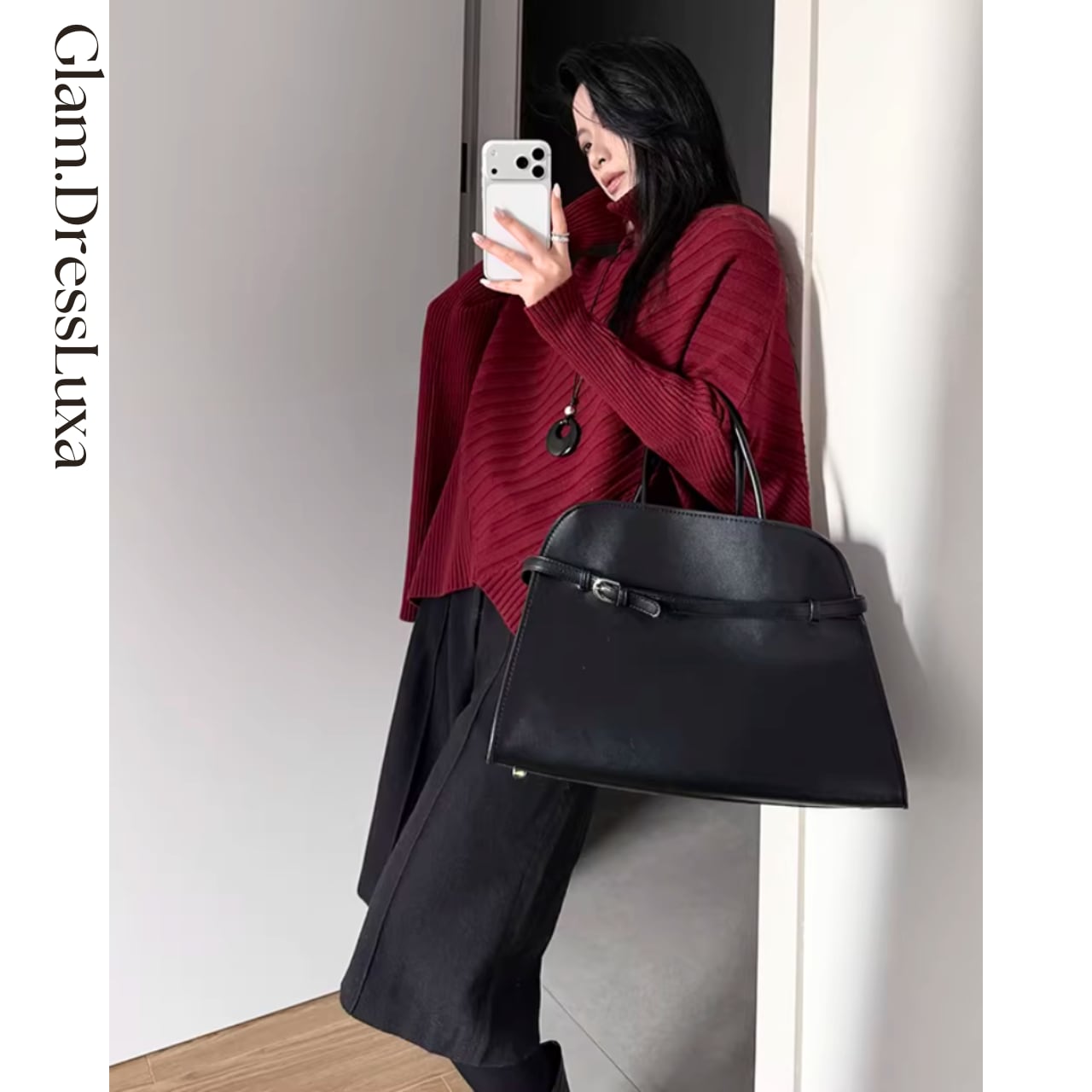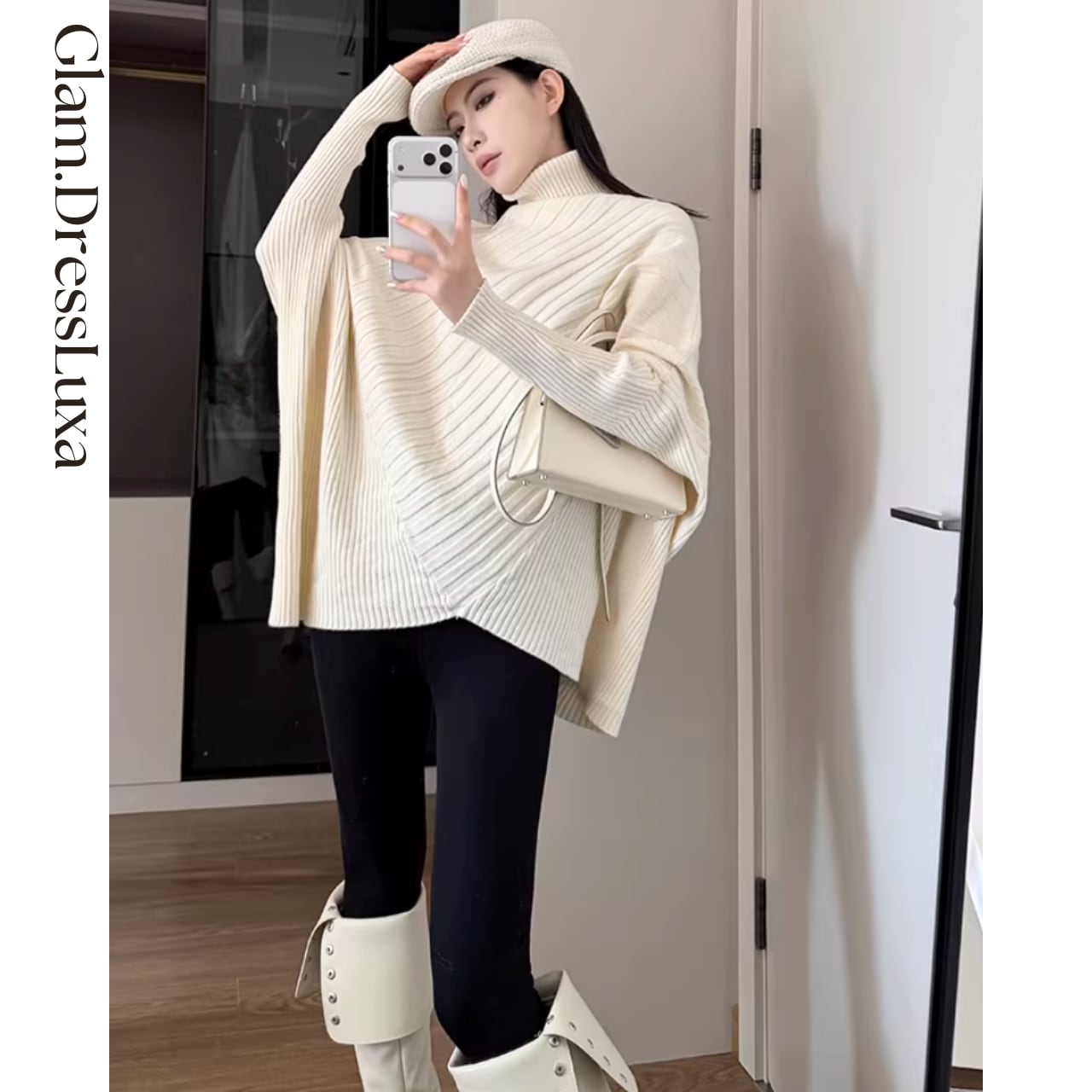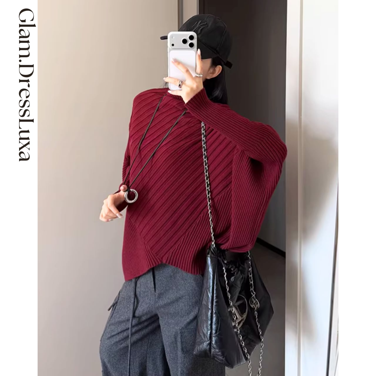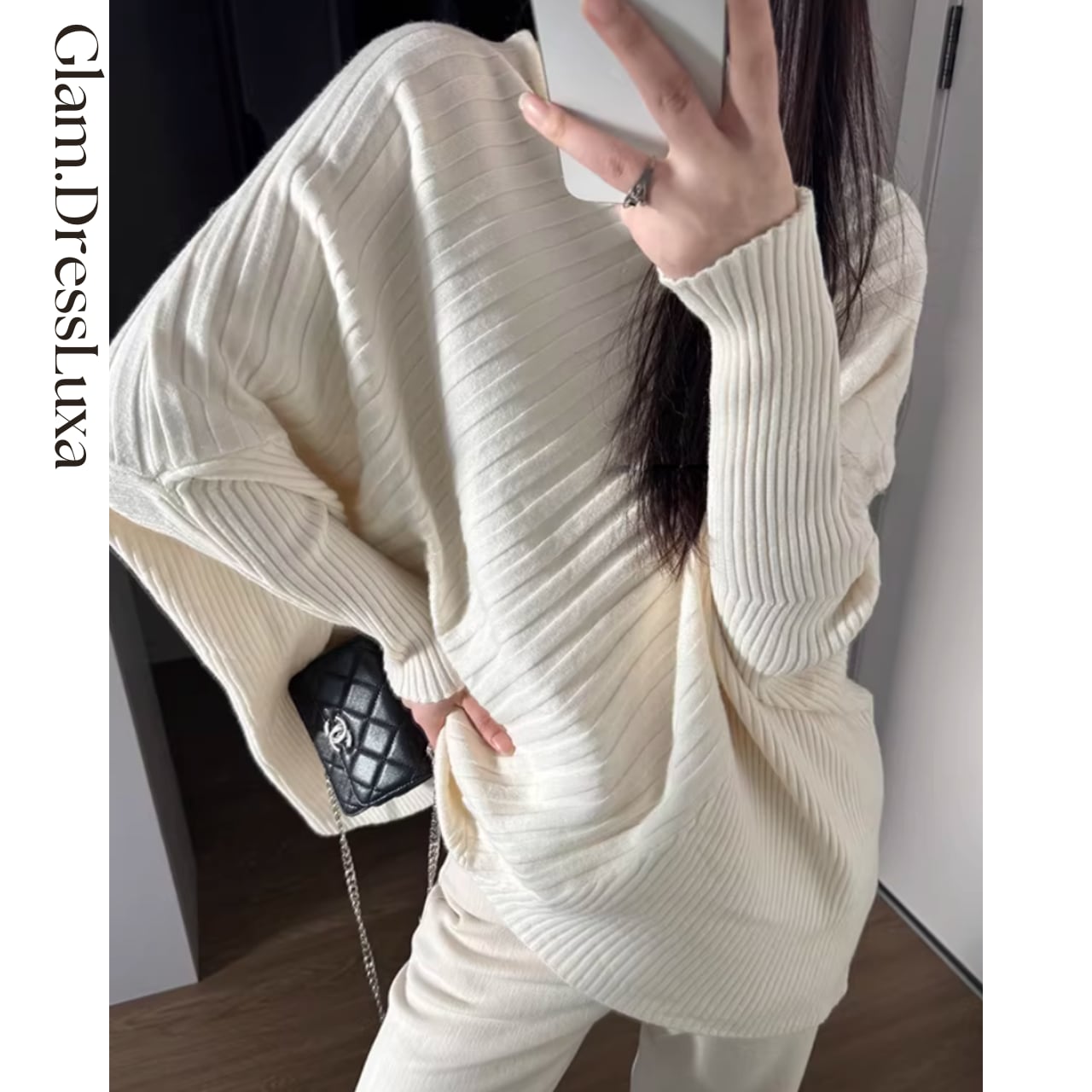 ・立体的なリブ編みとアシンメトリーなレイヤードデザインが印象的なニットセットアップ。