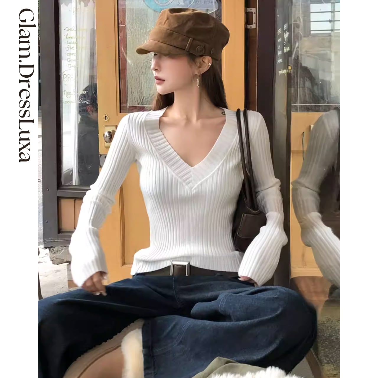 しなやかなリブ編みで仕立てた、女性らしさを引き立てるVネックニットトップス。