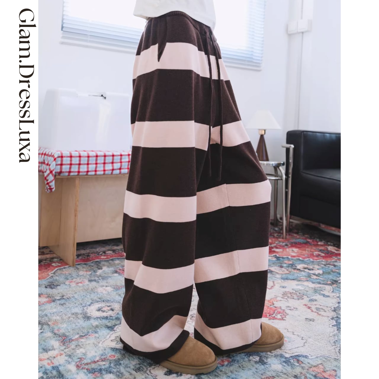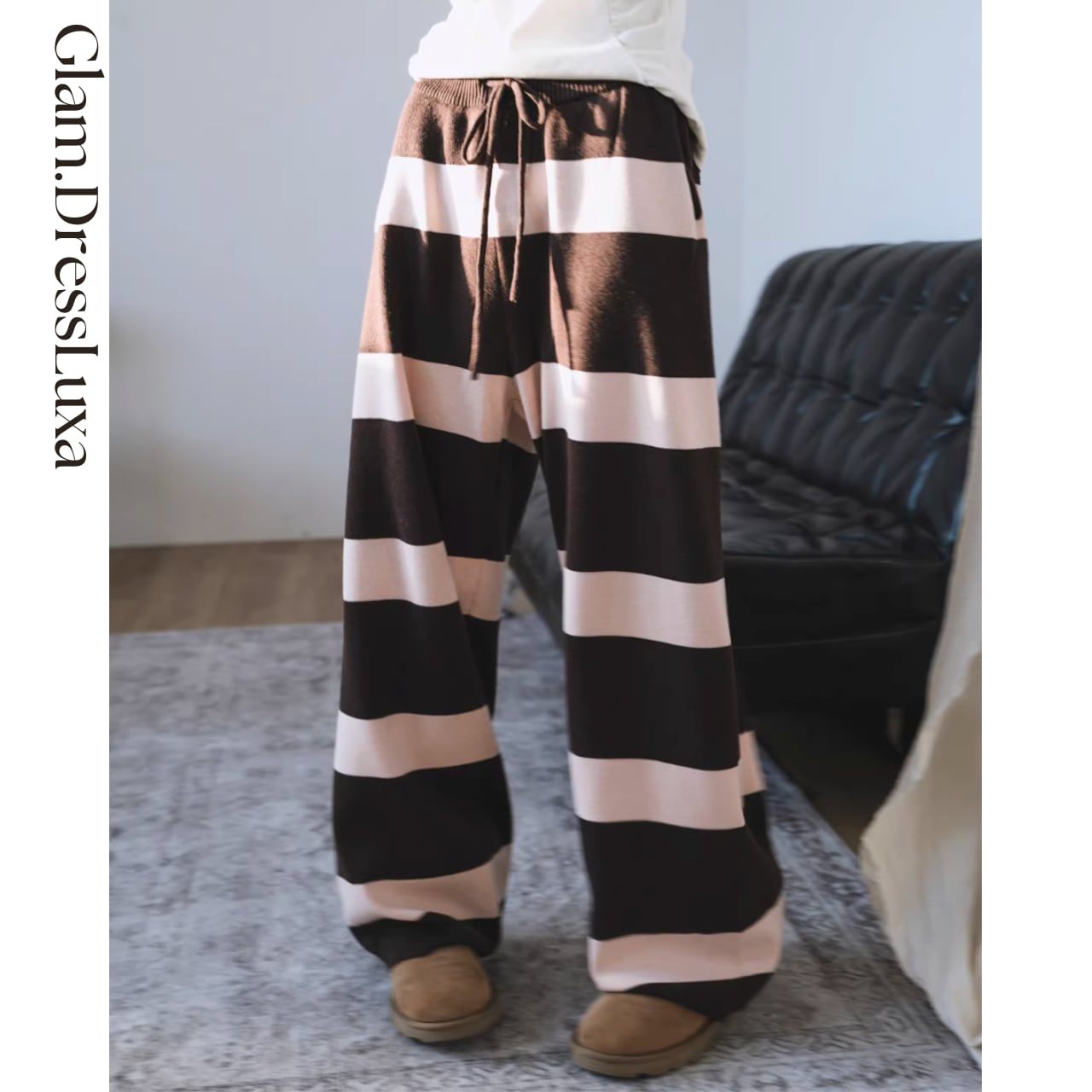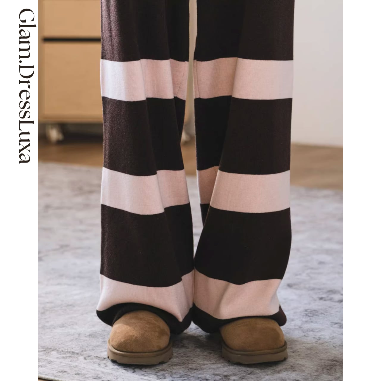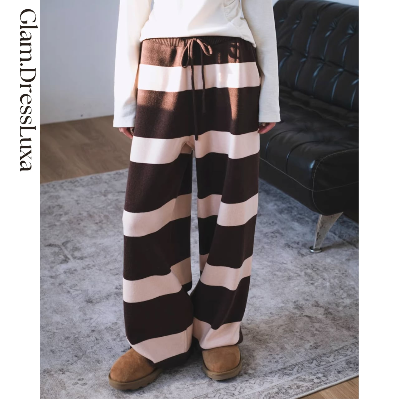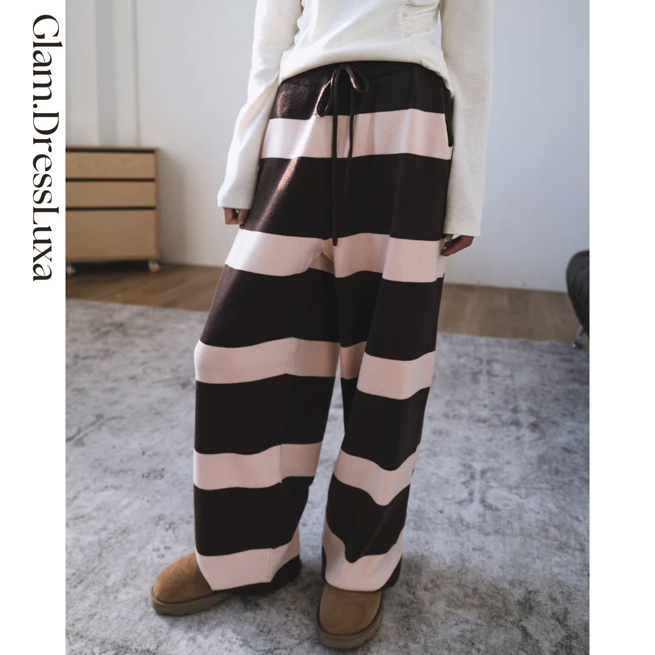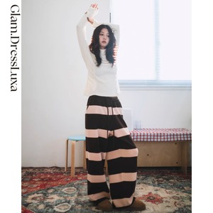 ・太めのボーダーが印象的な、存在感のあるニットパンツ。