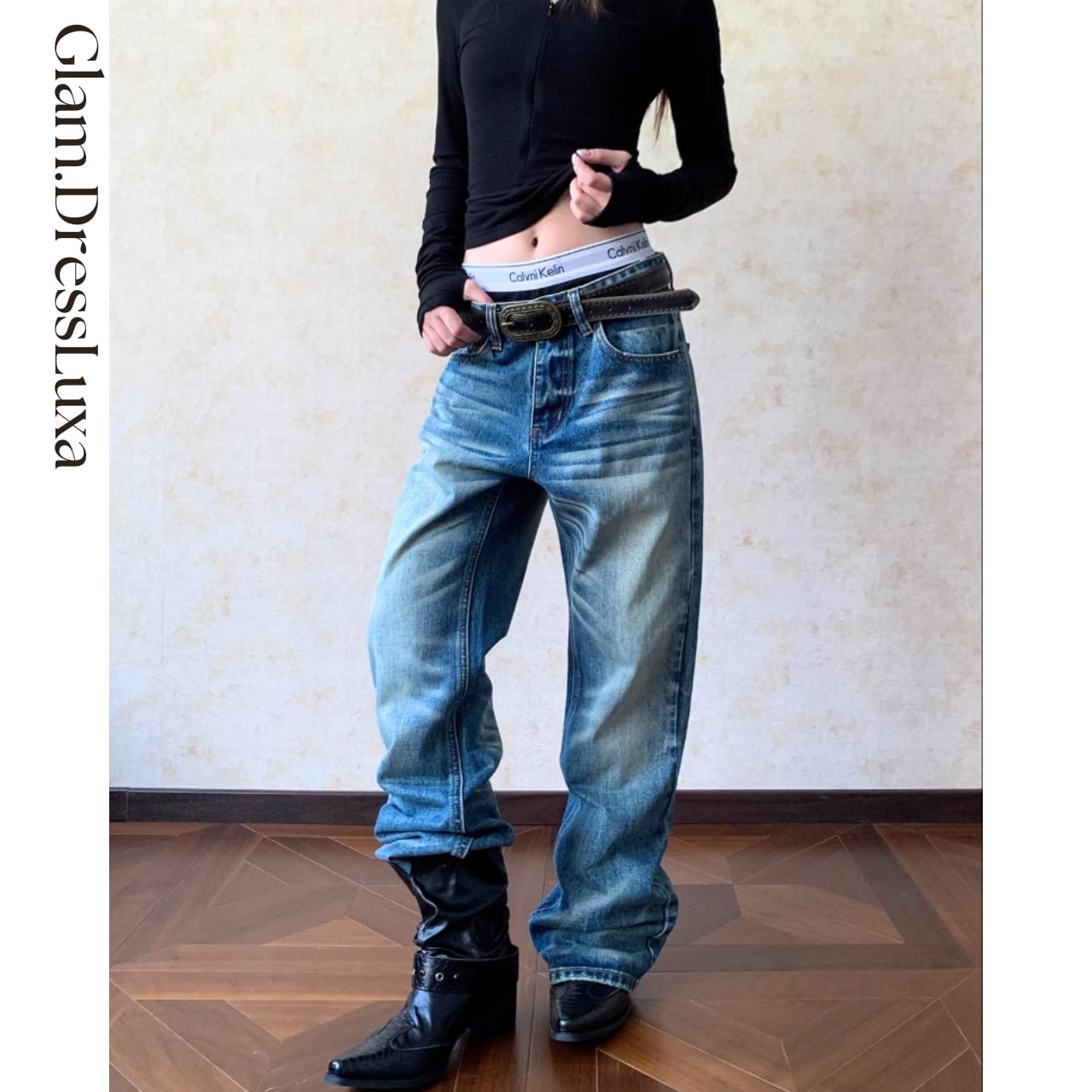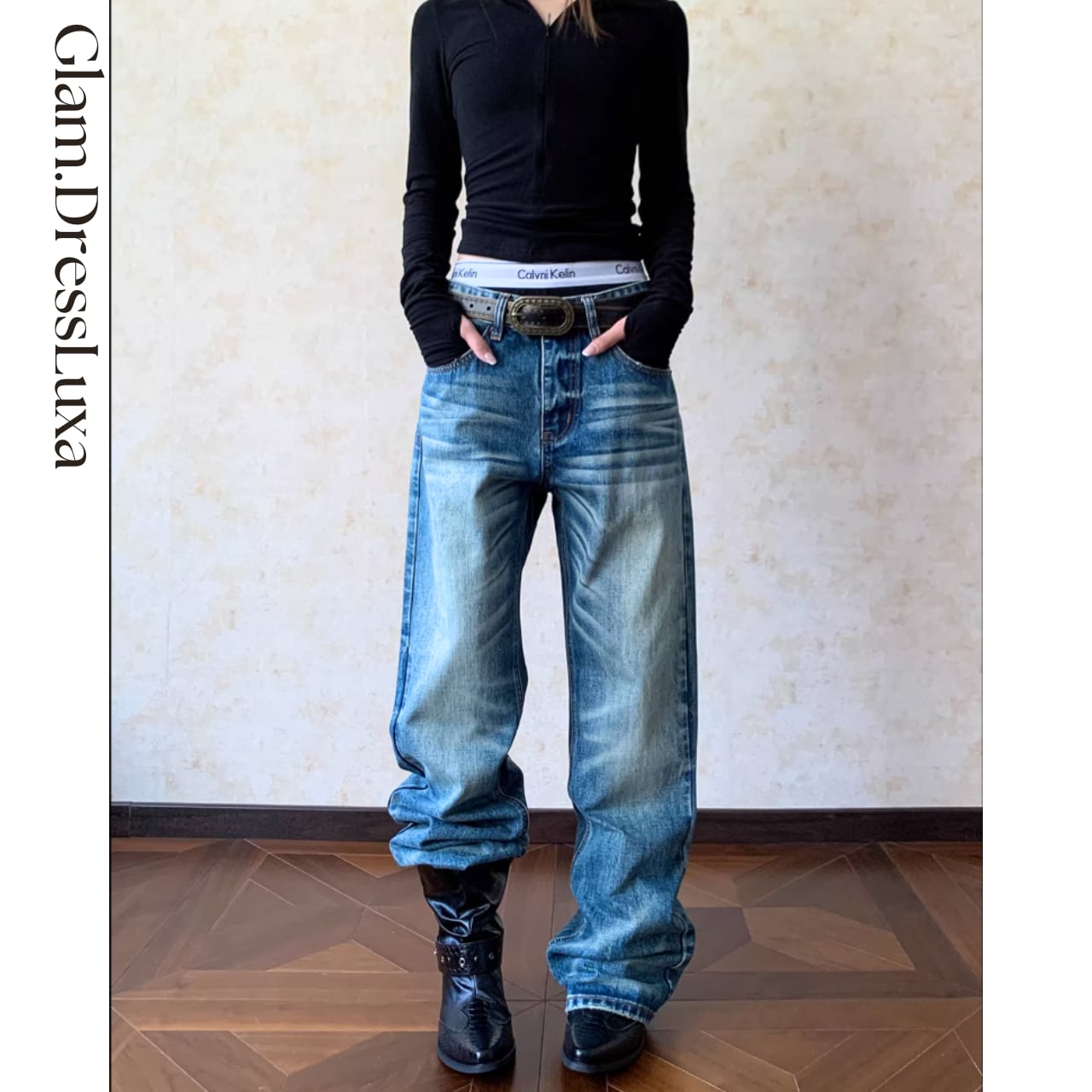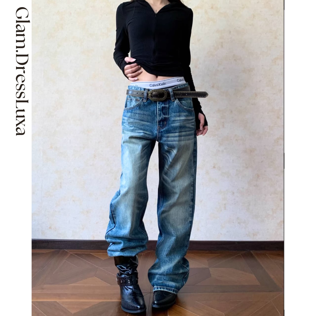 腰位置をやや落としたルーズなストレートシルエットが、抜け感のある大人カジュアルを演出します。