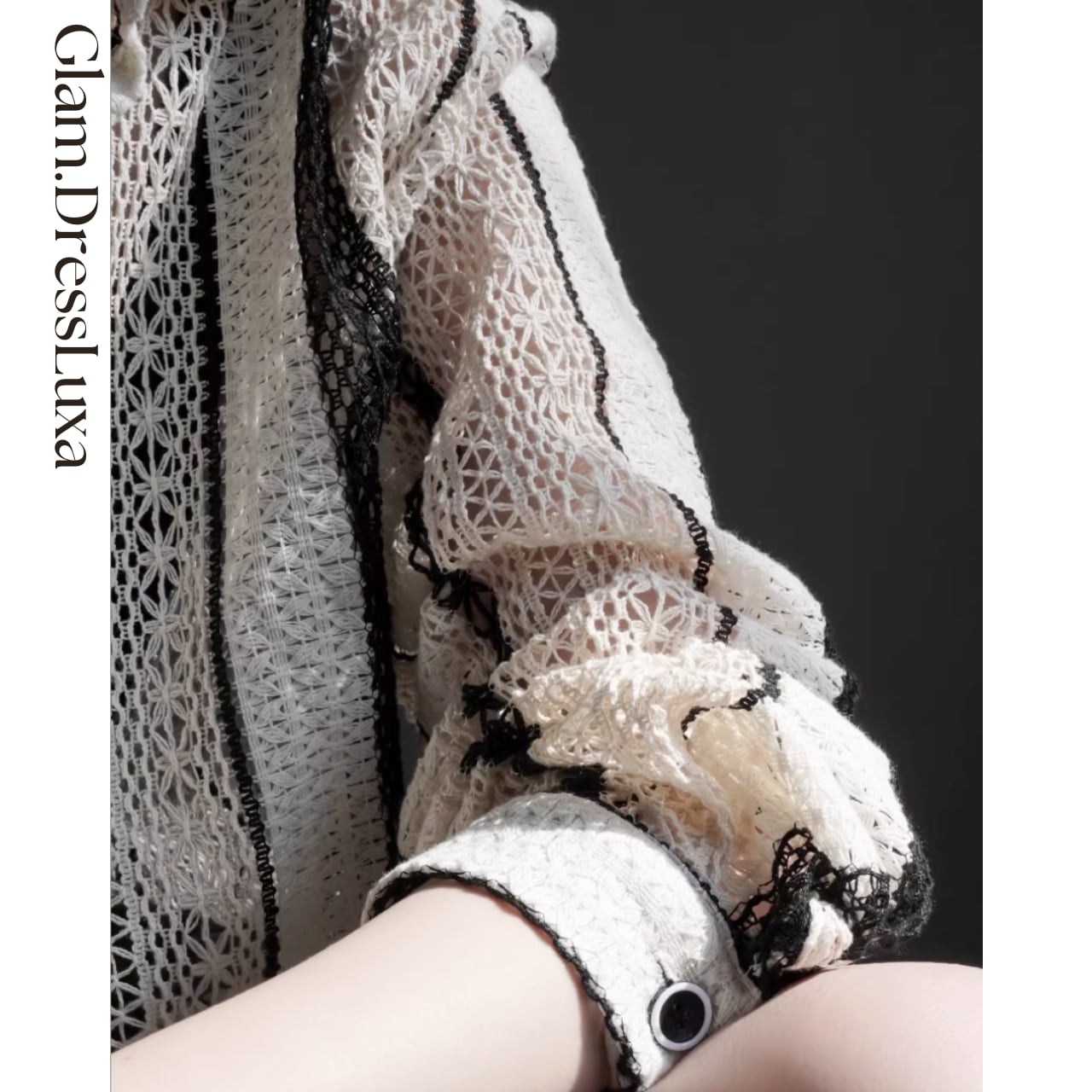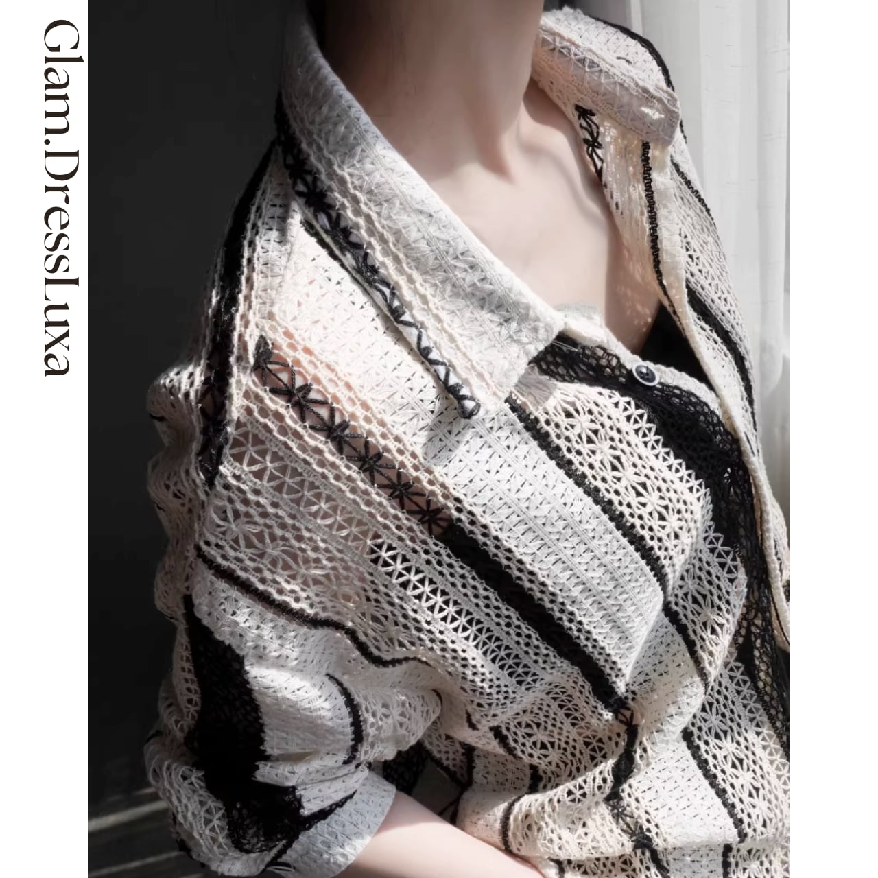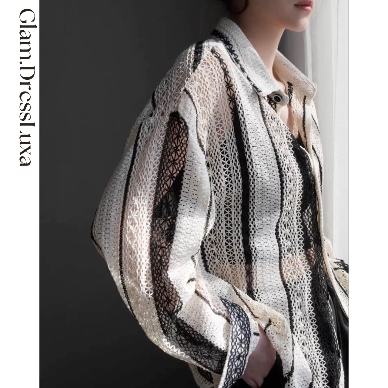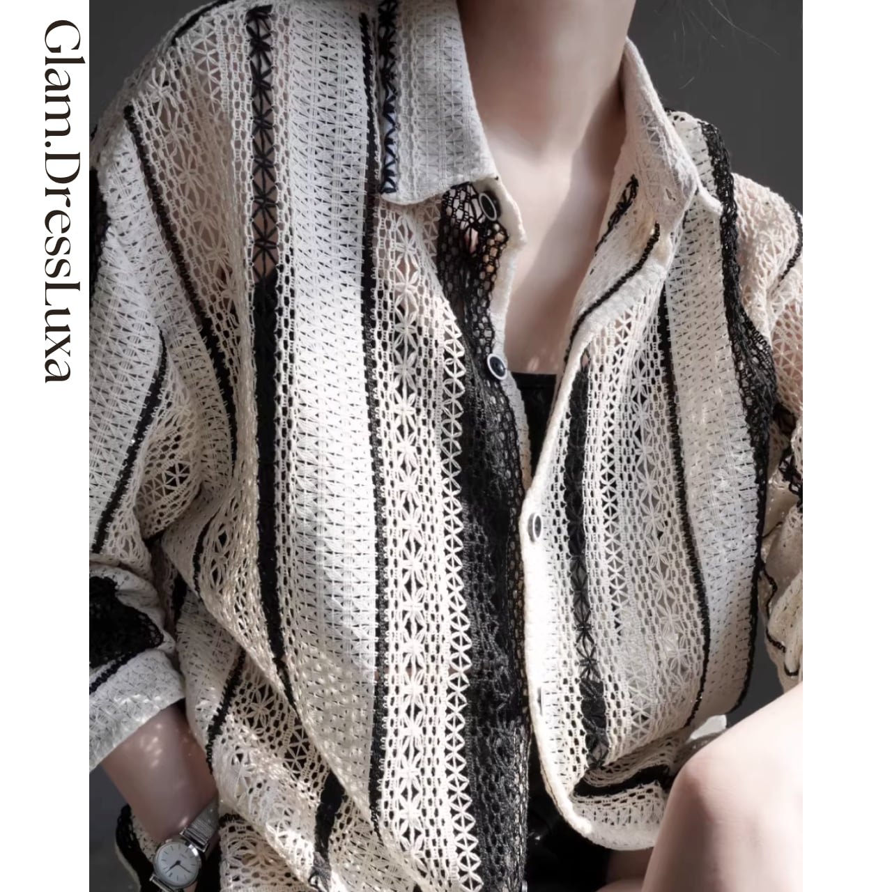 繊細なレース編みとストライプデザインを組み合わせたニットシャツ。