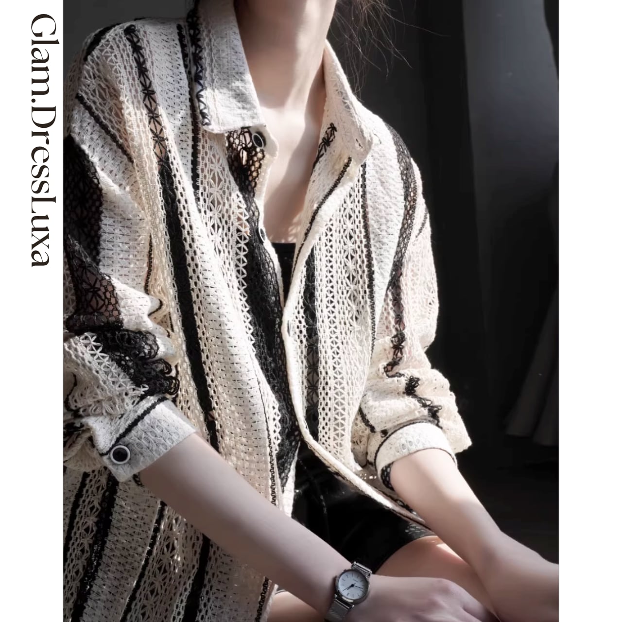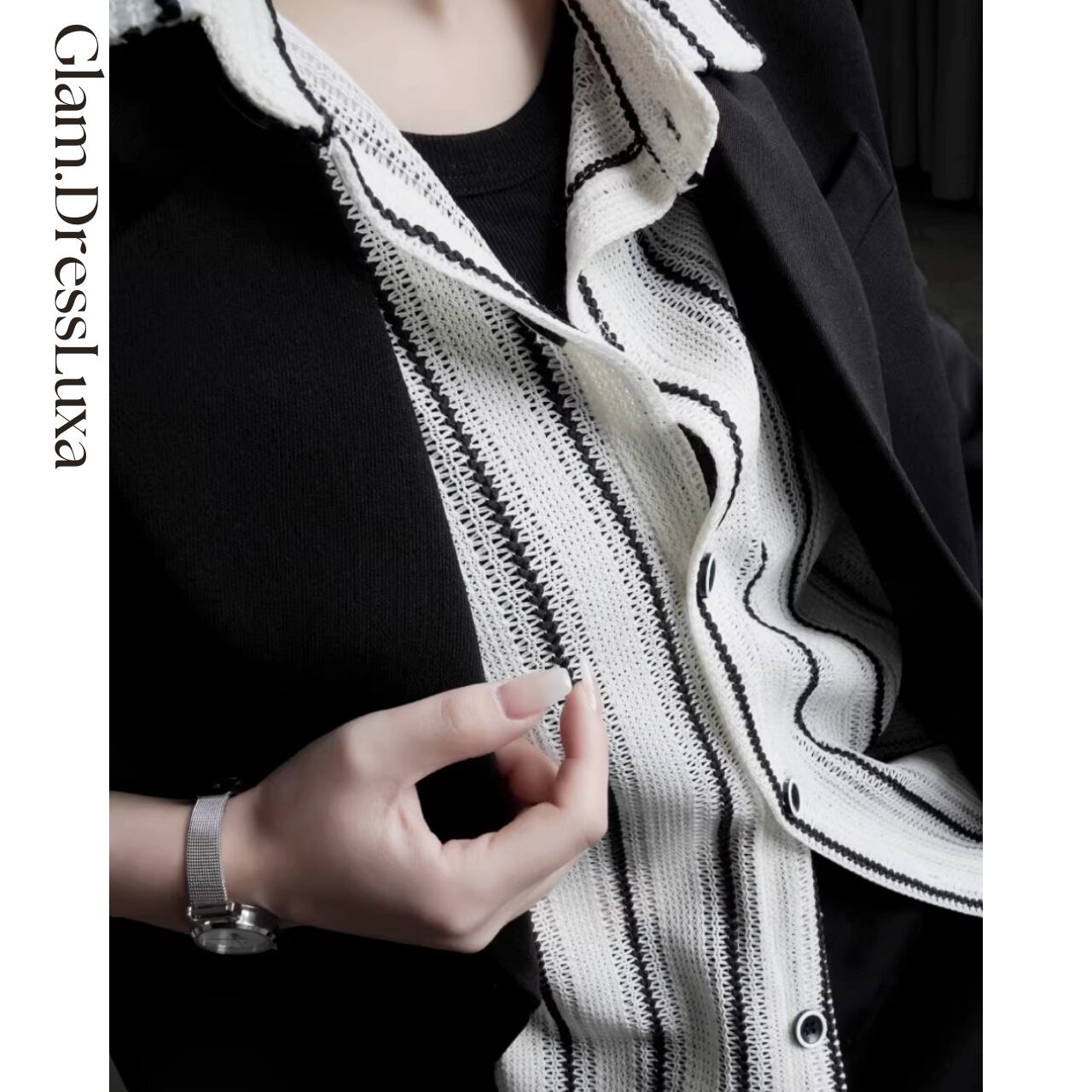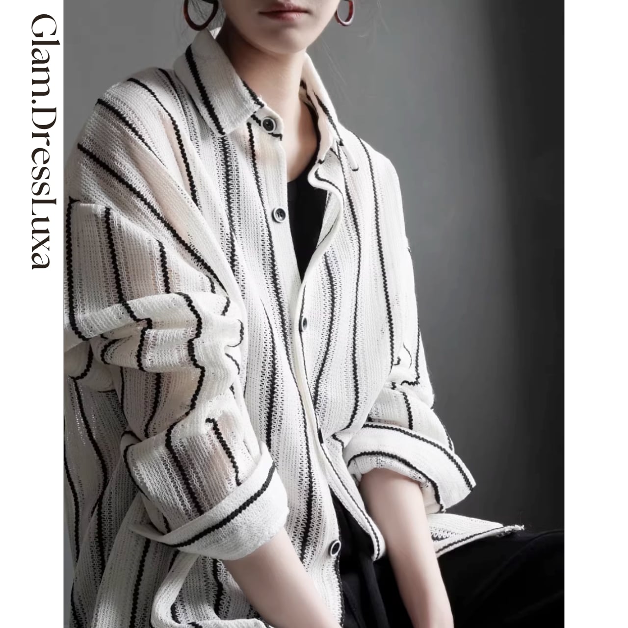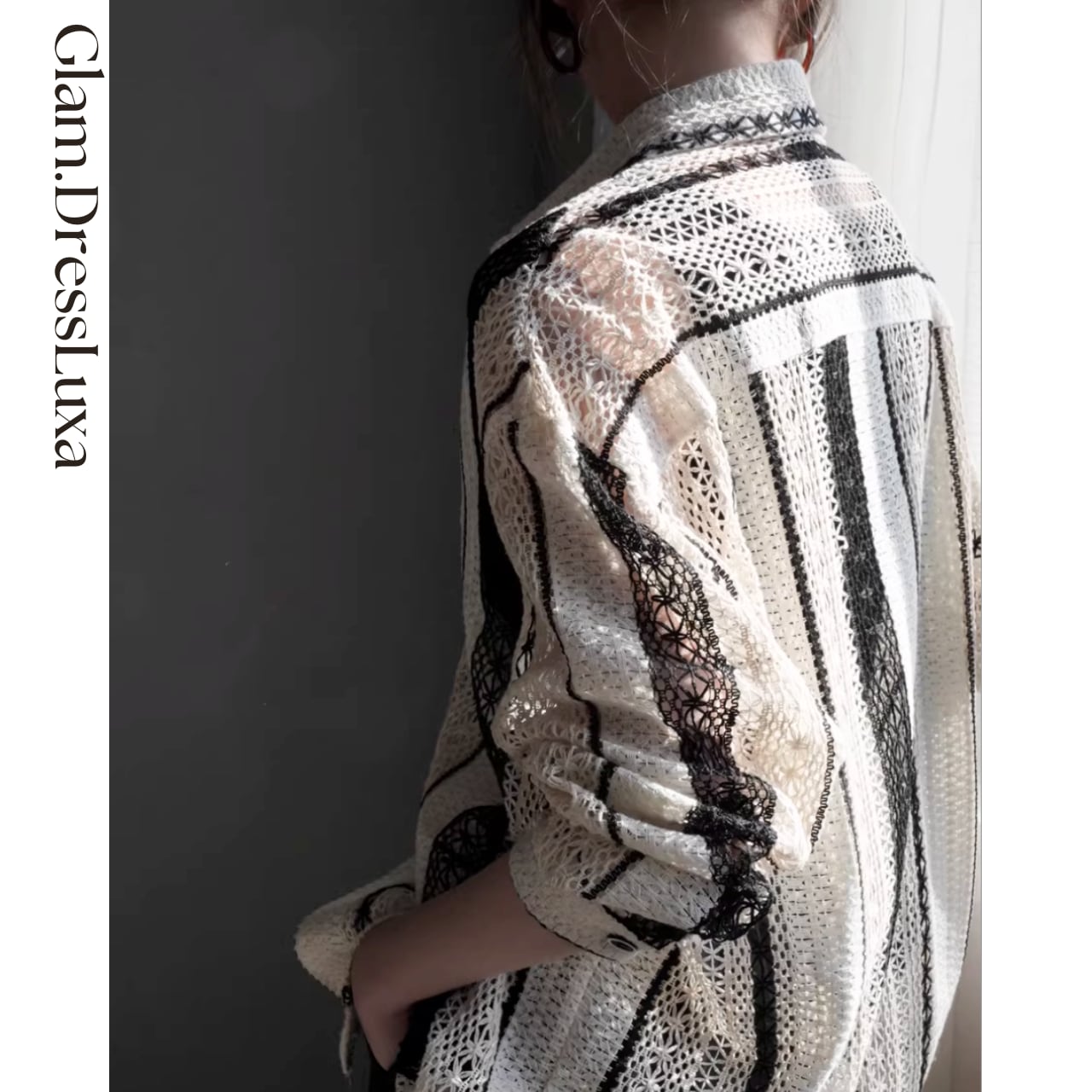 繊細なレース編みとストライプデザインを組み合わせたニットシャツ。
