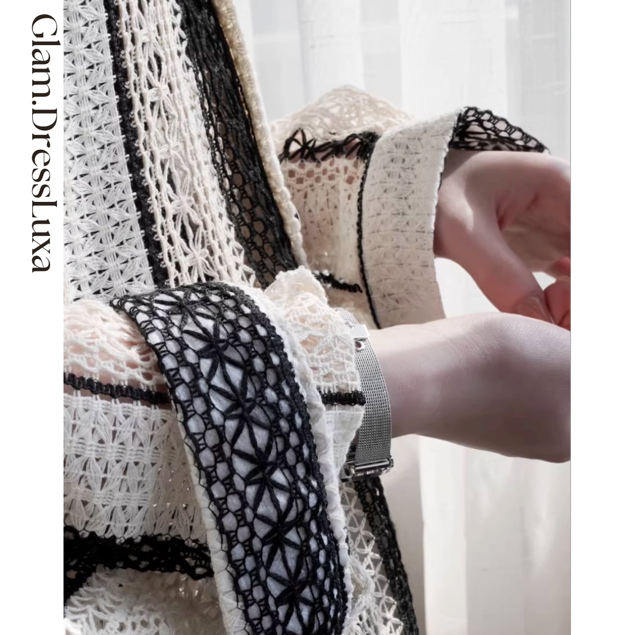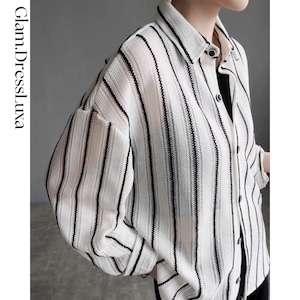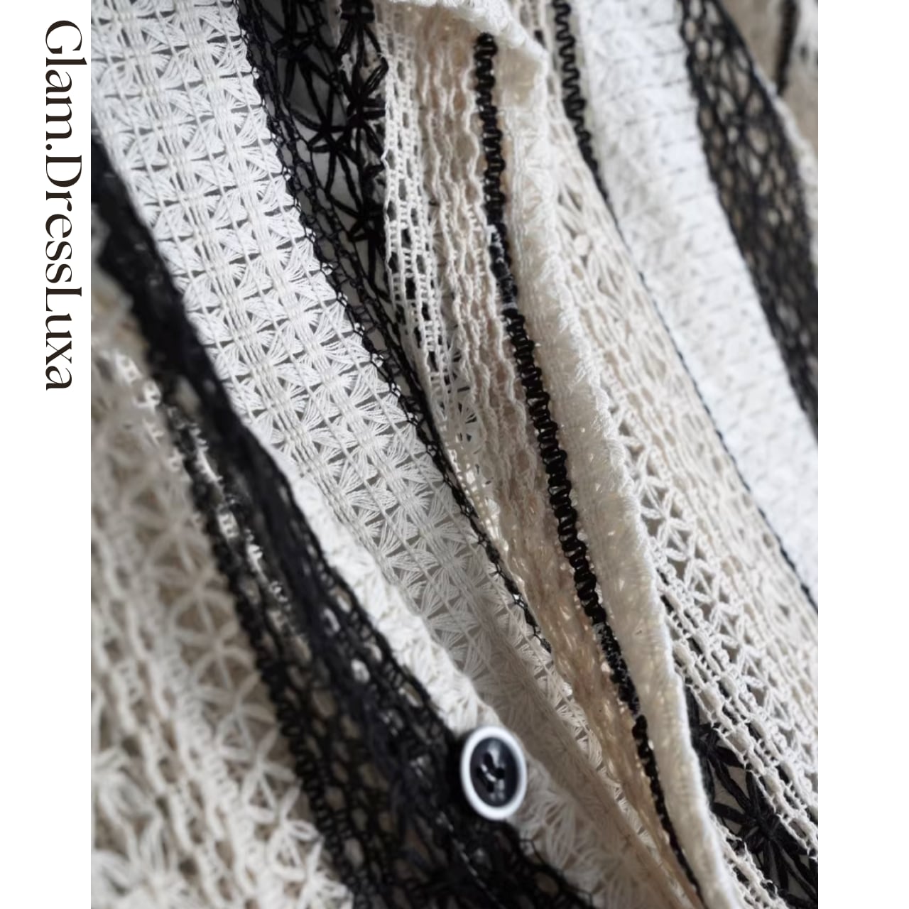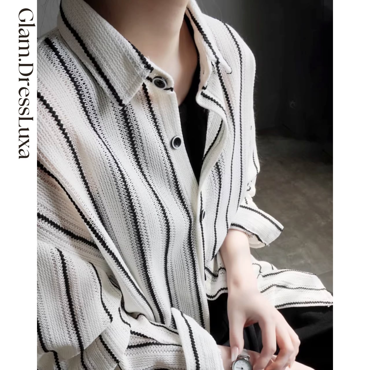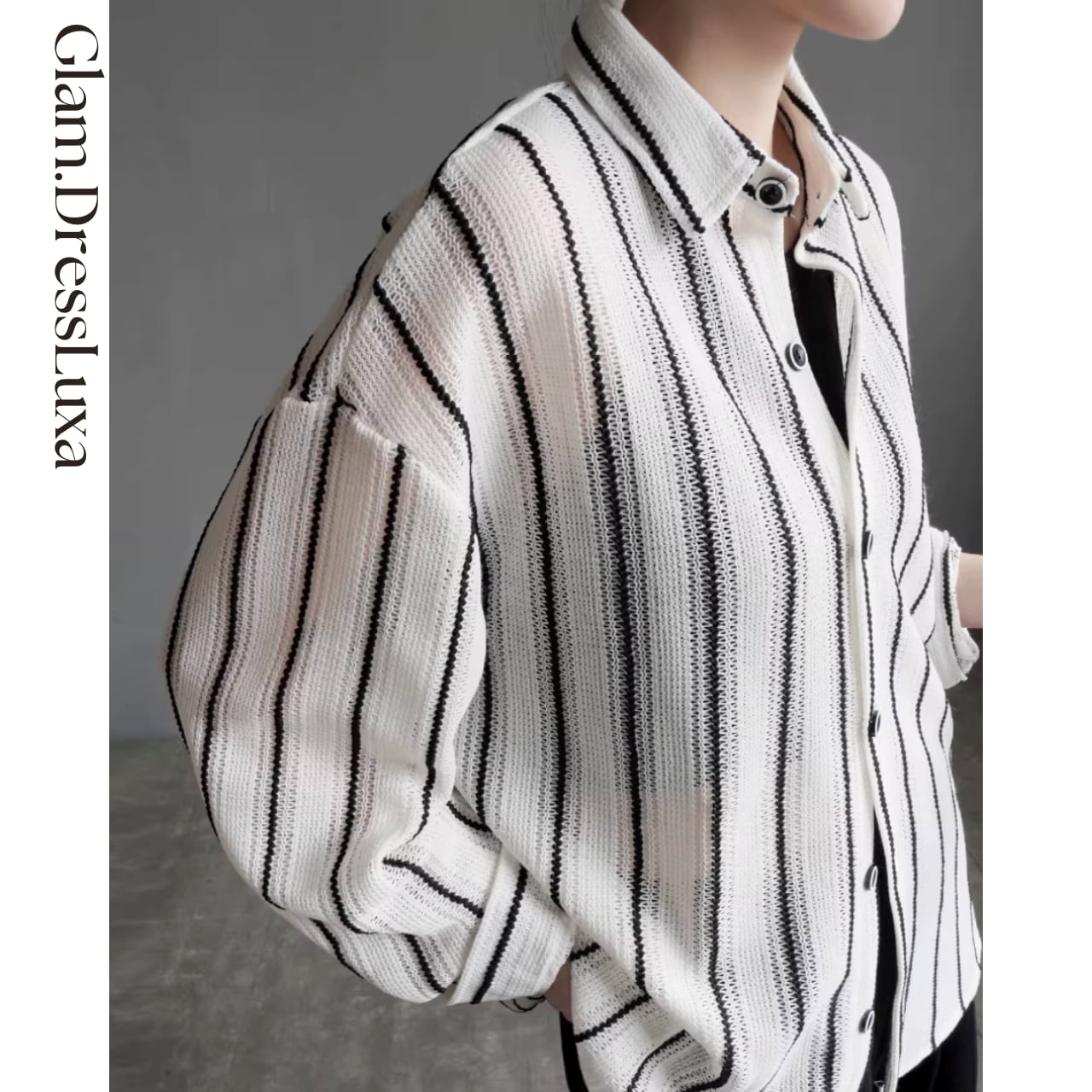 繊細なレース編みとストライプデザインを組み合わせたニットシャツ。