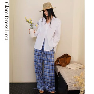 チェック柄のリラックスパンツ。